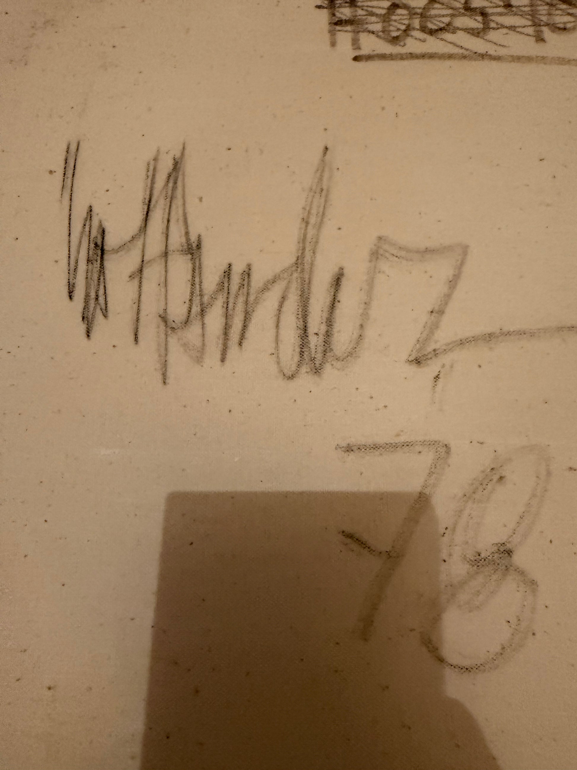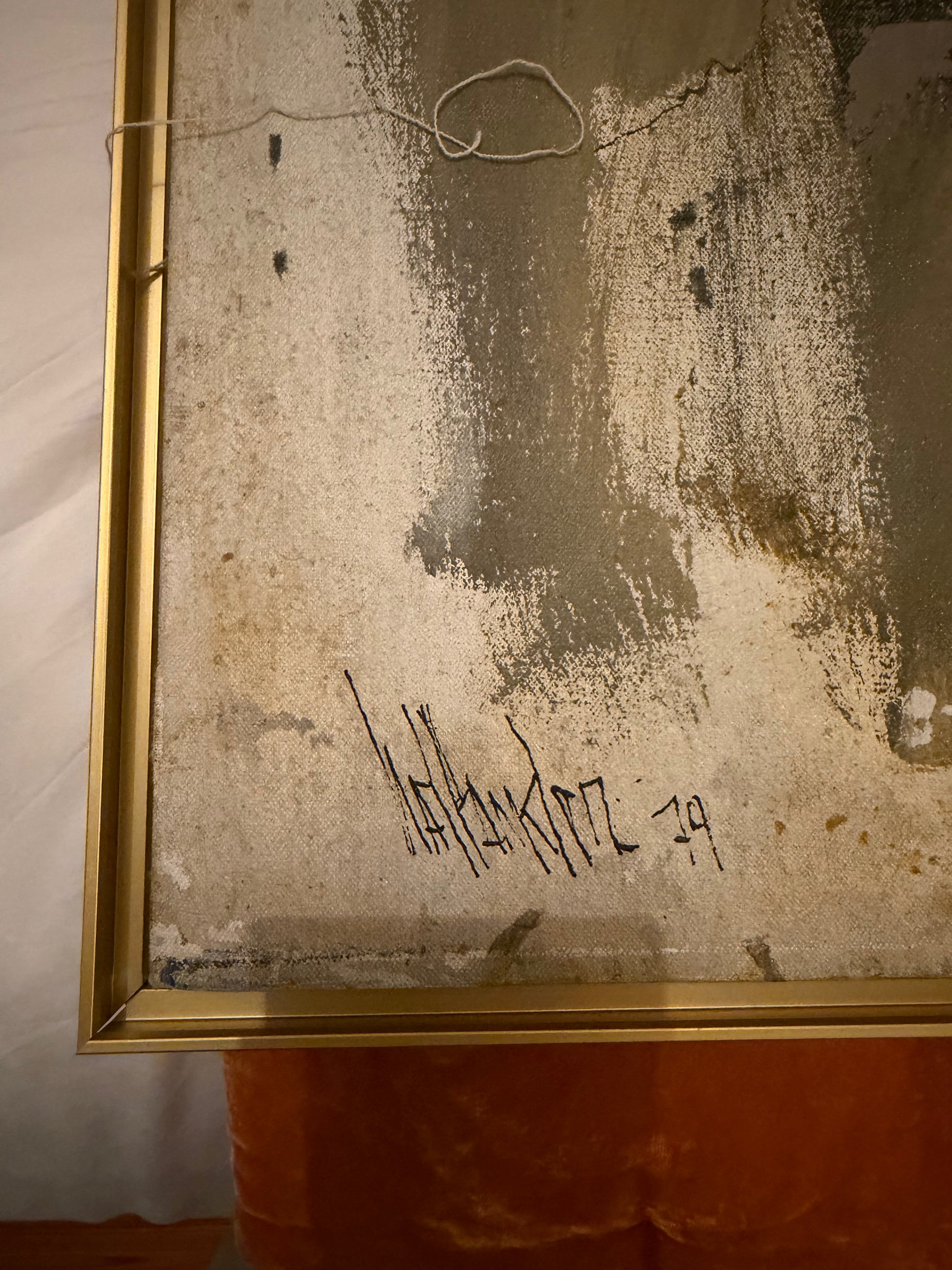American School (20th Century) circa 1978-1979, vintage oil on canvas, indistinctly signed "W. Hander/Hankler and dated "79" lower left, further signed and dated "78" en verso. Newly framed in a gold floating frame.