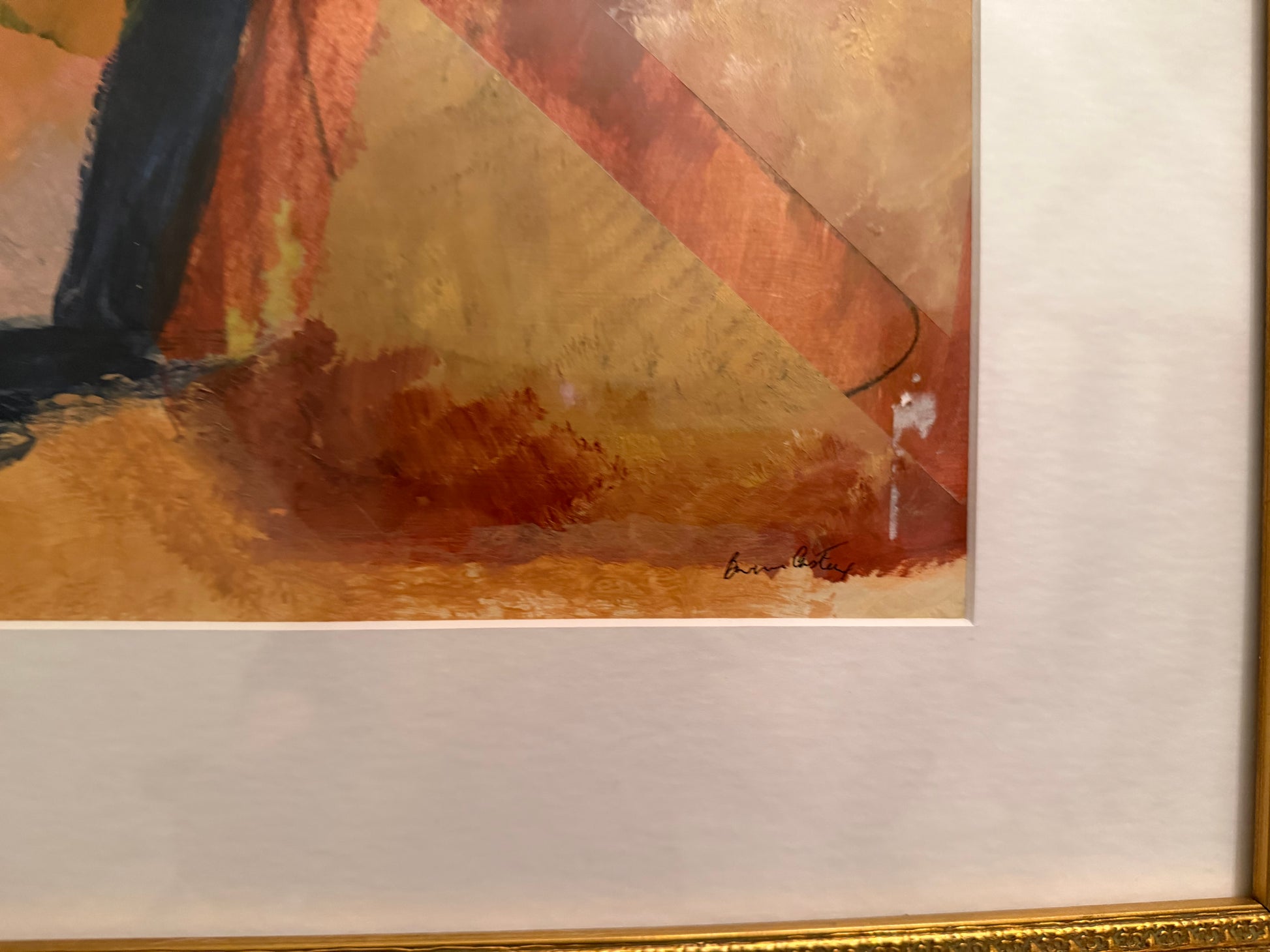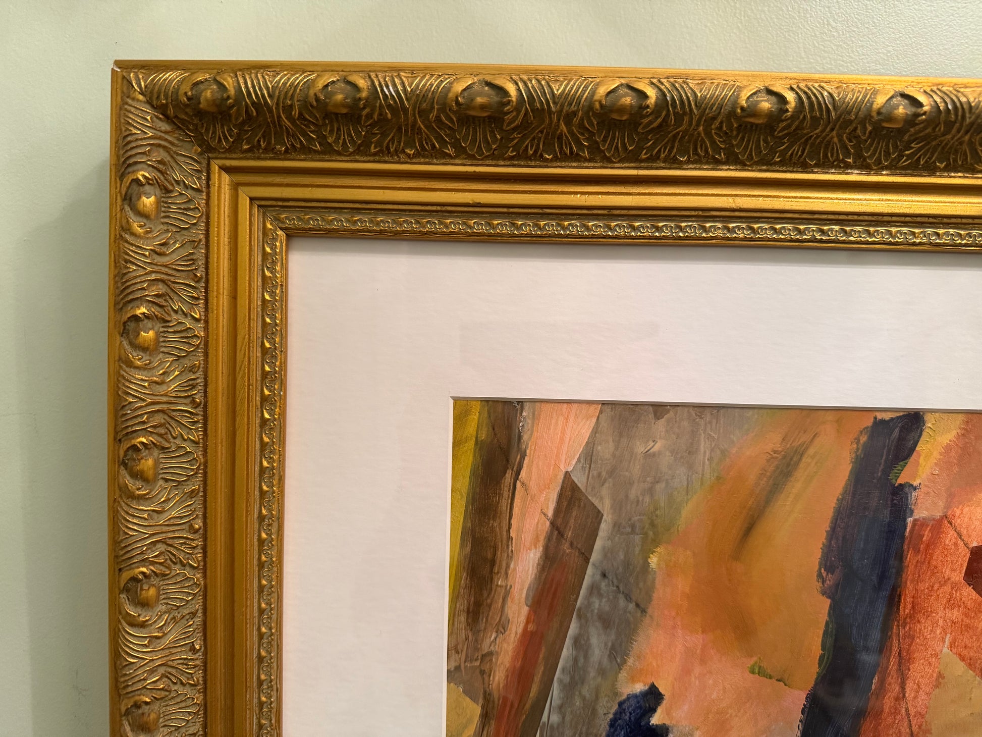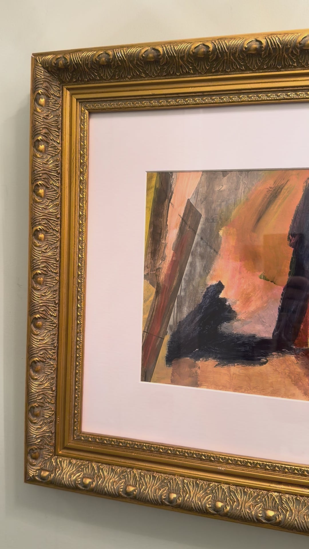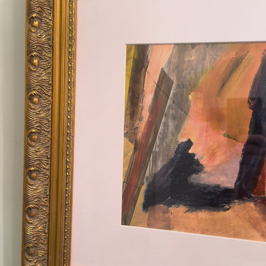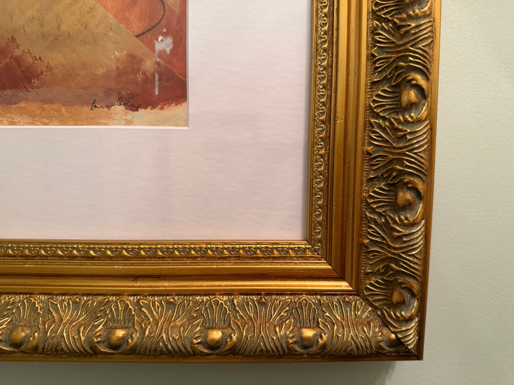 Warm, layered abstraction with bold, directional brushwork in ochre, terracotta, soft blush, and deep navy. The composition feels both grounded and in motion—earthy, modern, and quietly dramatic. Set in an ornate gold frame that adds contrast and timeless charm.