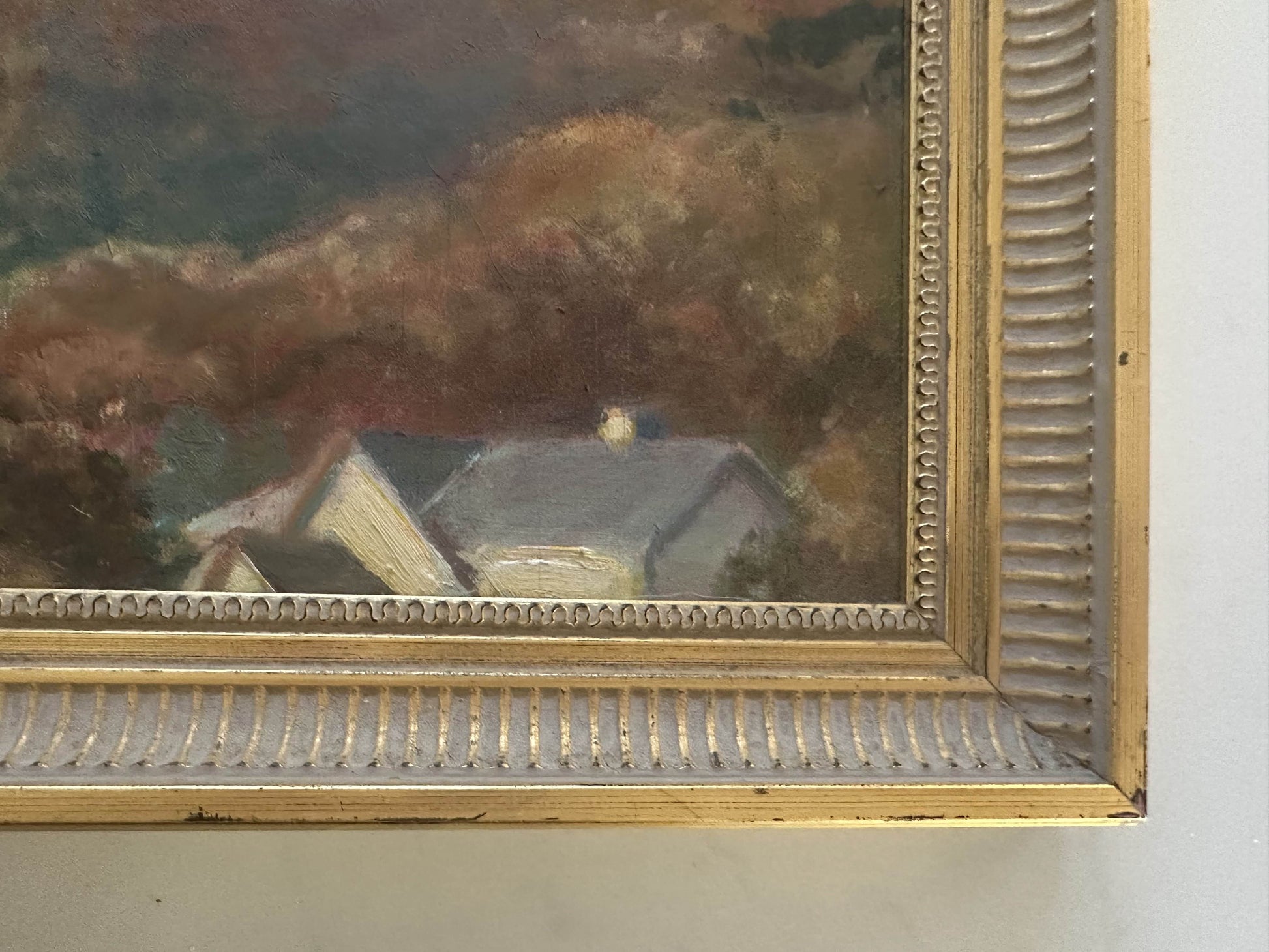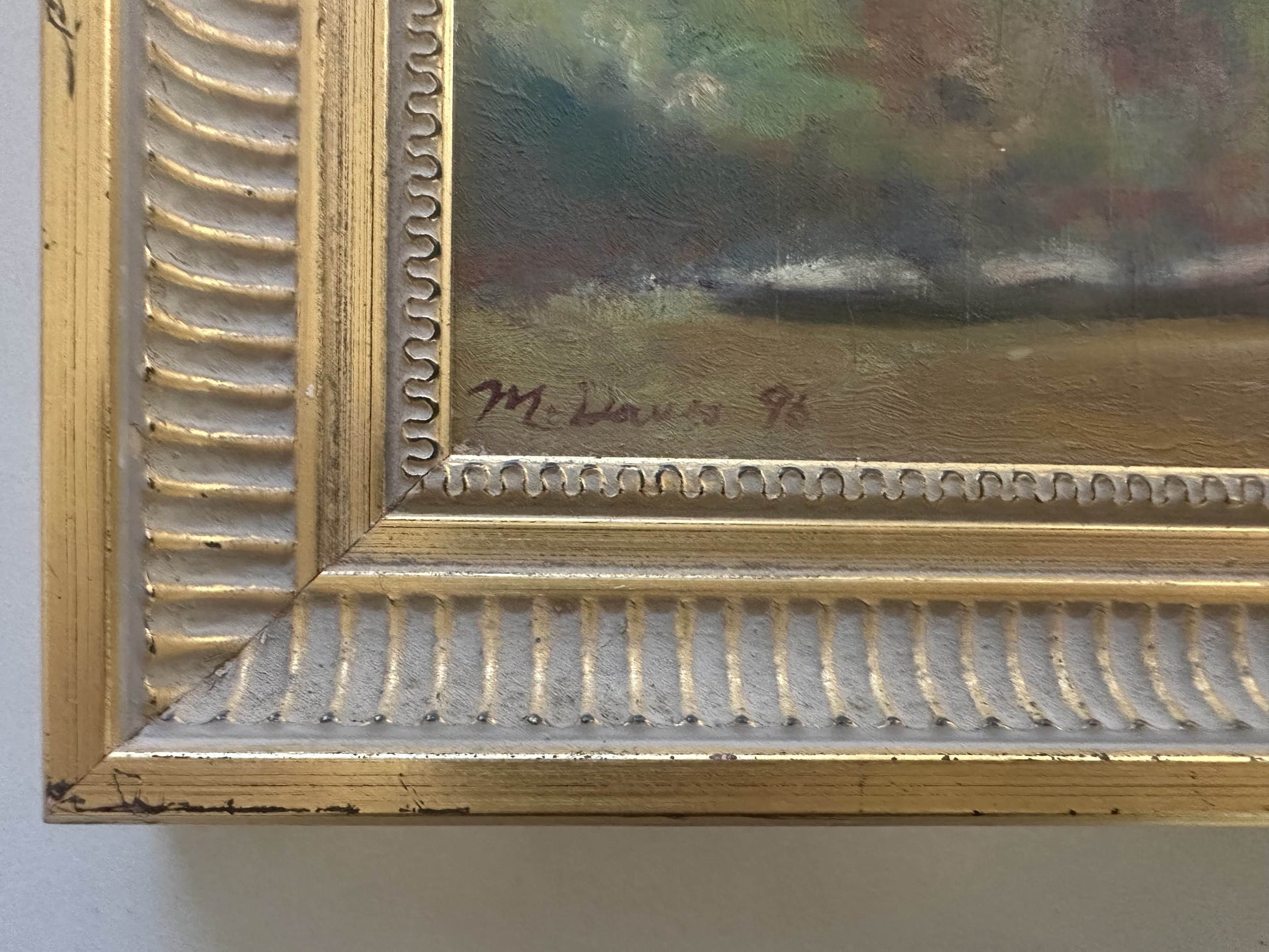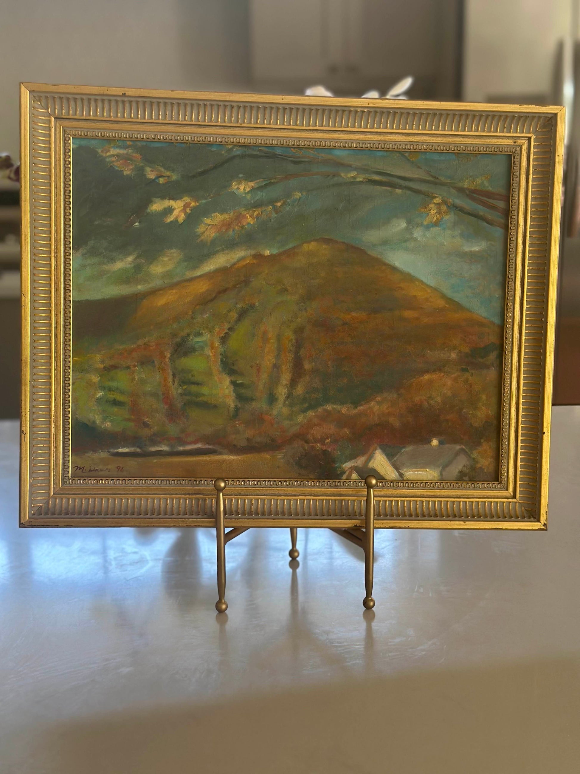 Autumn Mountain, an original oil on board by M. Davis. Signed lower left, dated 1996. Depicts autumn trees on a mountain side with a house. Gilt wooden frame with lined motifs.