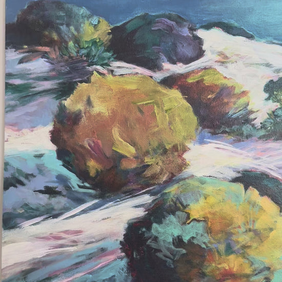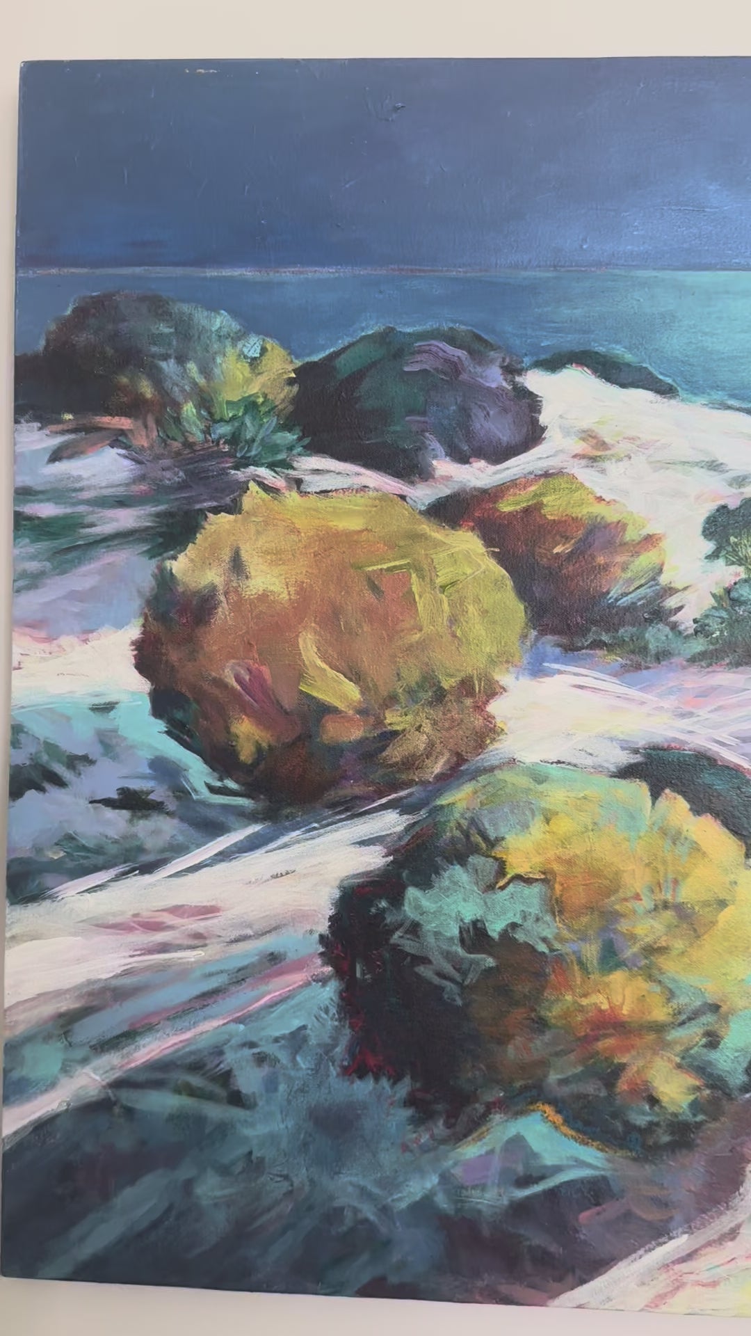 A vibrant, color-drenched oil painting of a serene beach by celebrated Ocean Springs artist Susie Thomas Ranager. Known for her evocative coastal scenes, Ranager has long been regarded as one of the Gulf Coast’s most talented painters. A graduate of Mississippi State University, she has dedicated her career to the arts in both professional and personal capacities. For many years, she served as Curator of Collections and Workshop Coordinator at the Ohr-O’Keefe Museum of Art, while continuing to create her own distinctive body of work. This piece reflects her mastery of capturing the luminous beauty and tranquility of the Mississippi Gulf Coast she calls home.