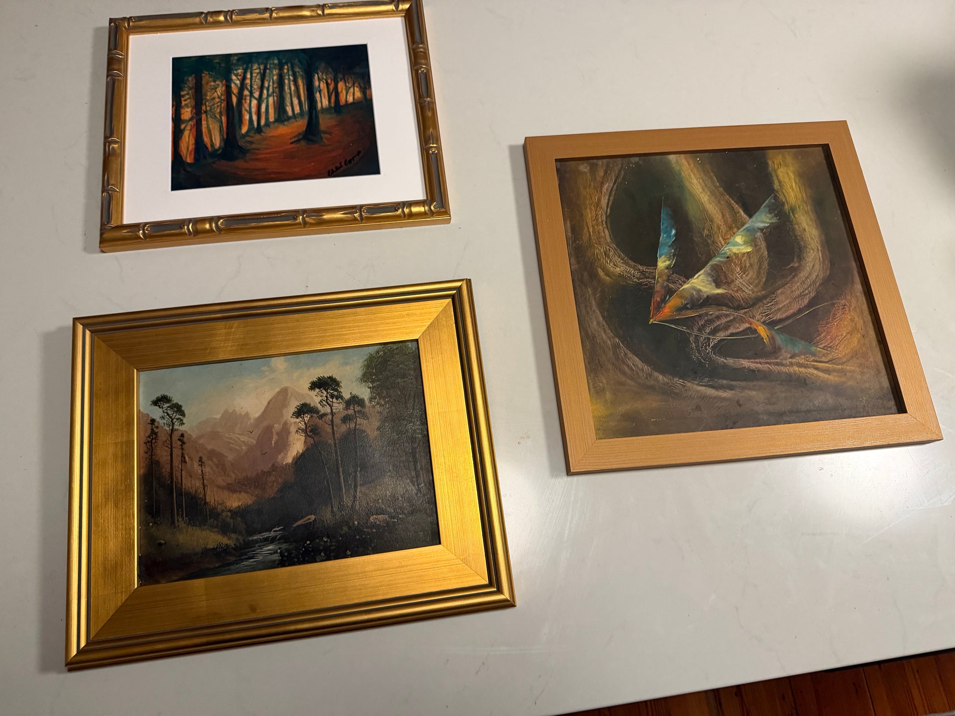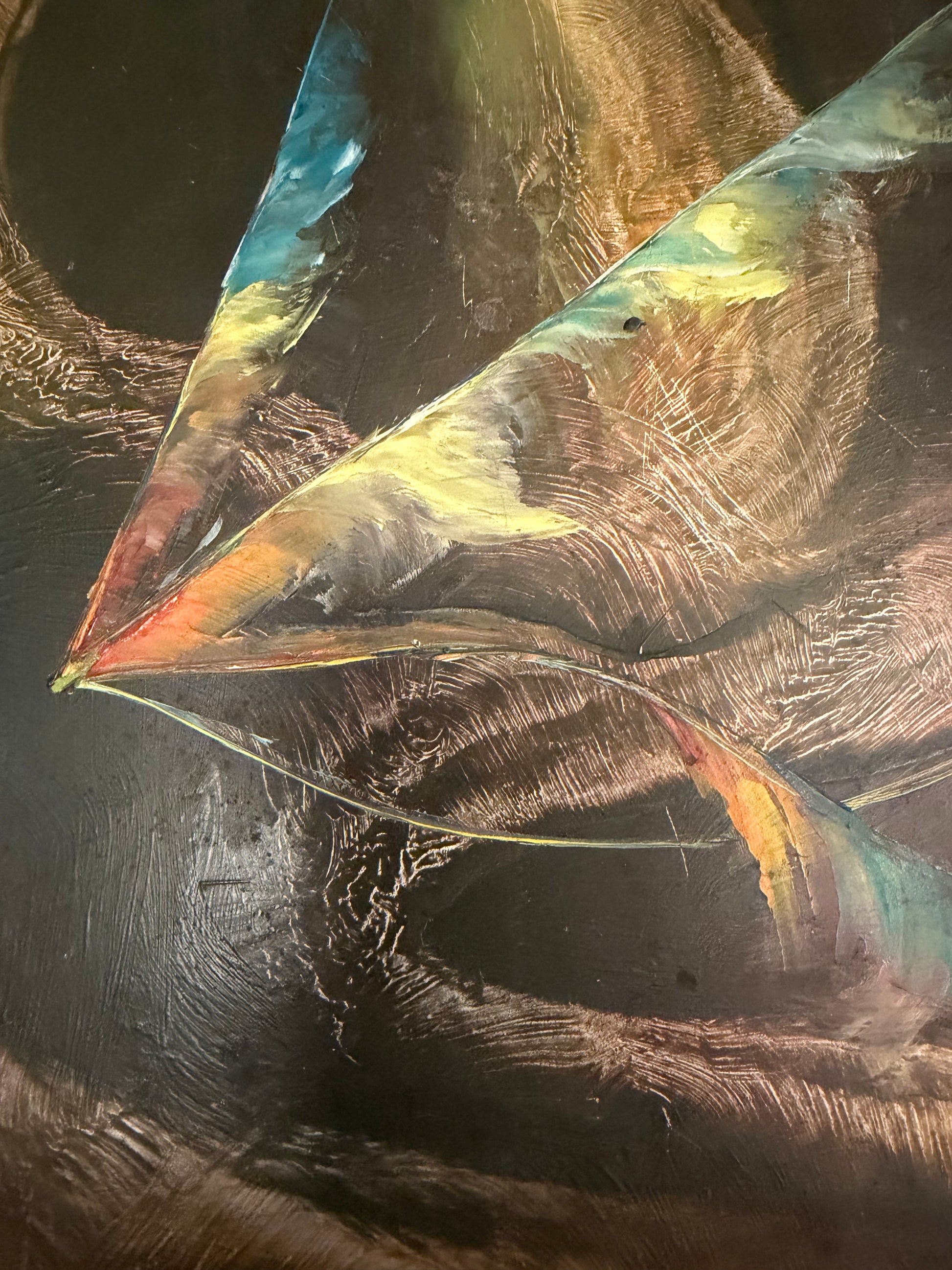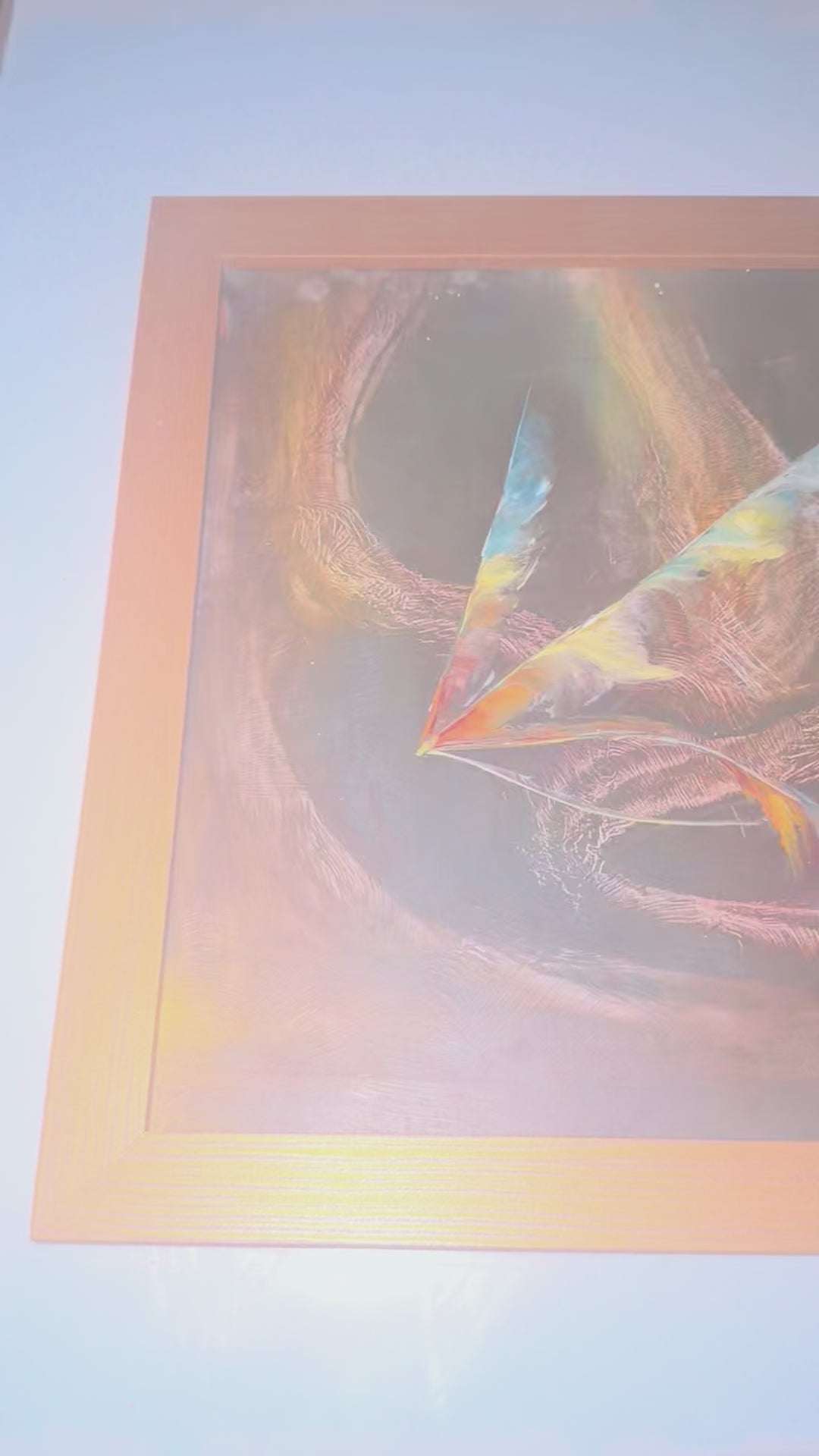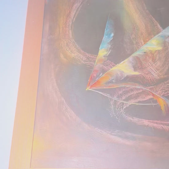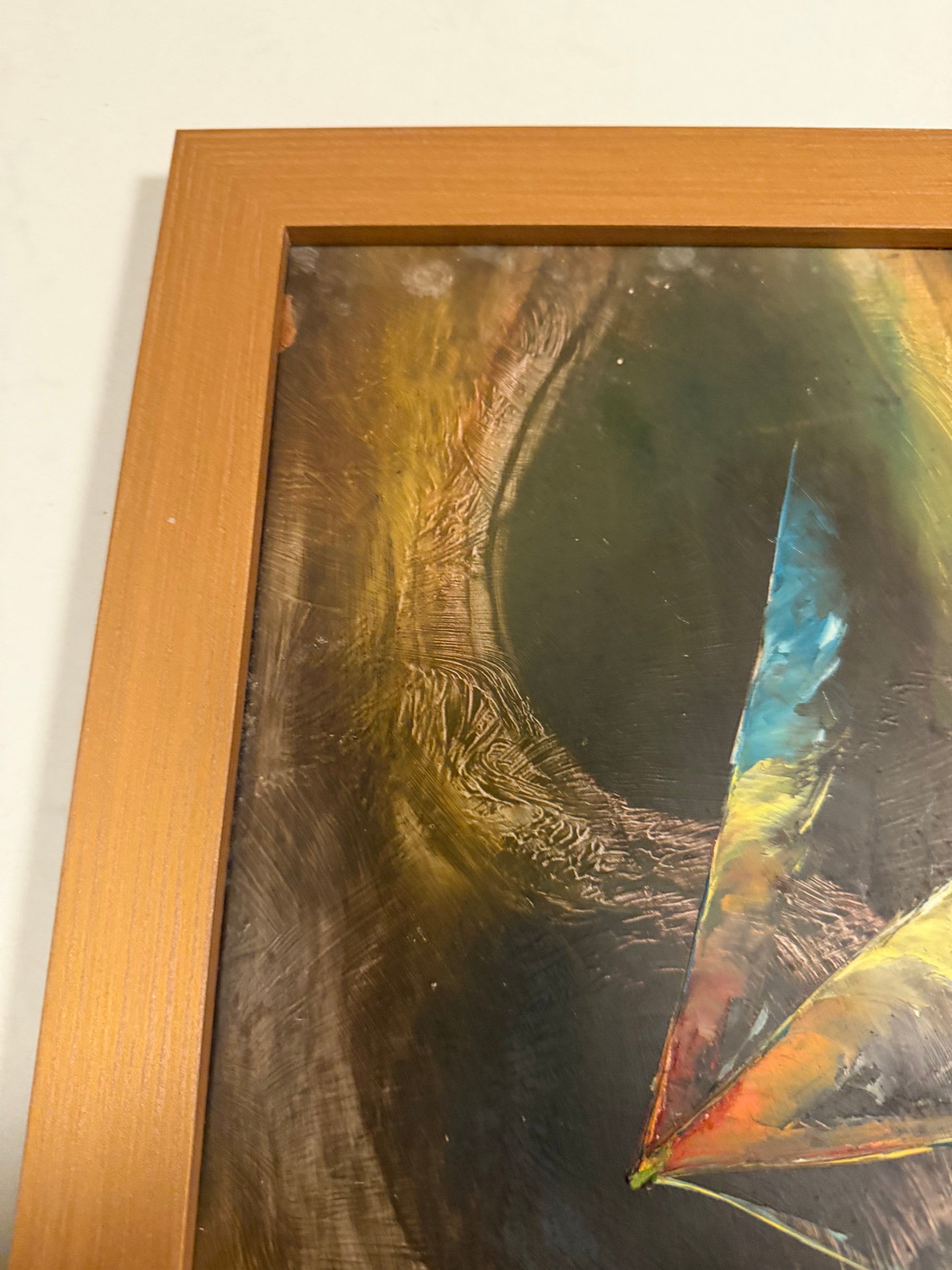 Abstract oil painting on board of a psychedelic dandelion seed. Signed lower right. Lovely modern gold frame.