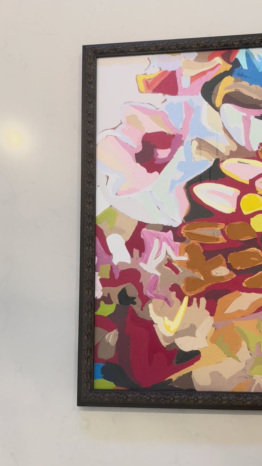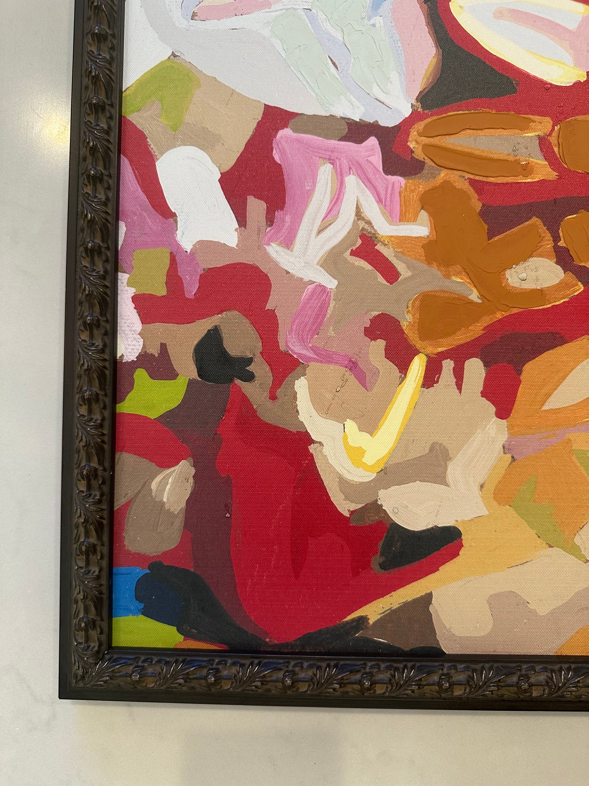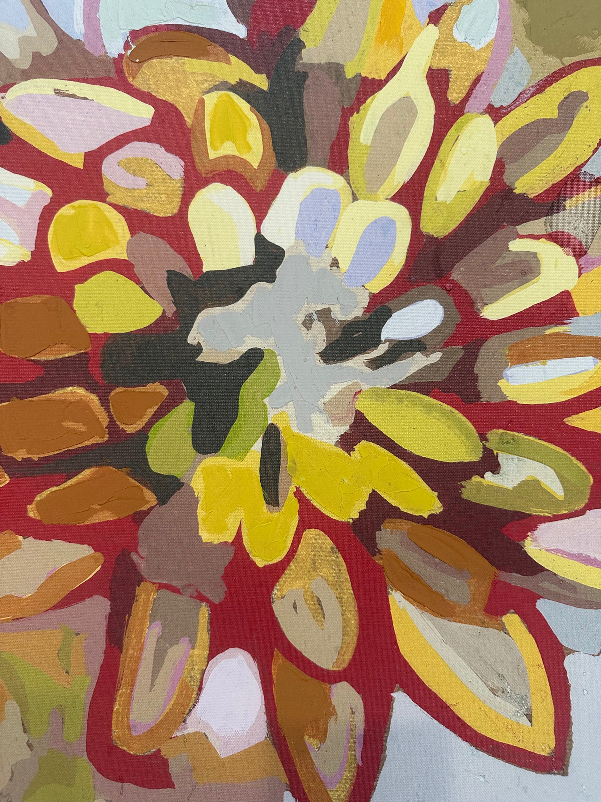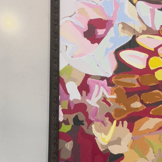 Original acrylic painting on canvas, mounted on board. Depicts chrysanthemum flowers in abstract style with vivid colors. Signed by Hescock in the lower right. Includes a carved wood custom frame.