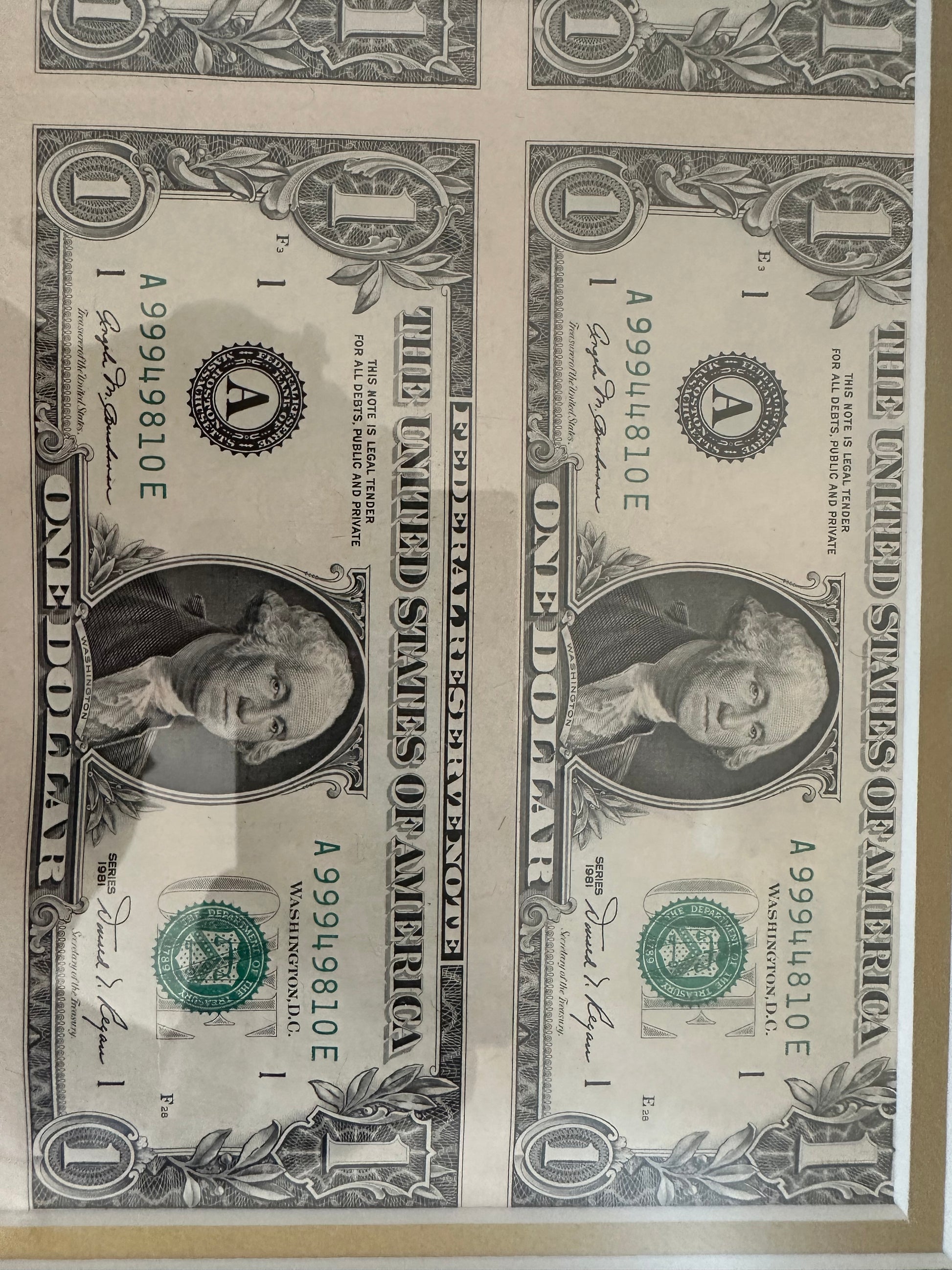 Nicely custom framed sheet of uncut $1 bills from the 1980s. Great for an office! (and you get $32 back!)