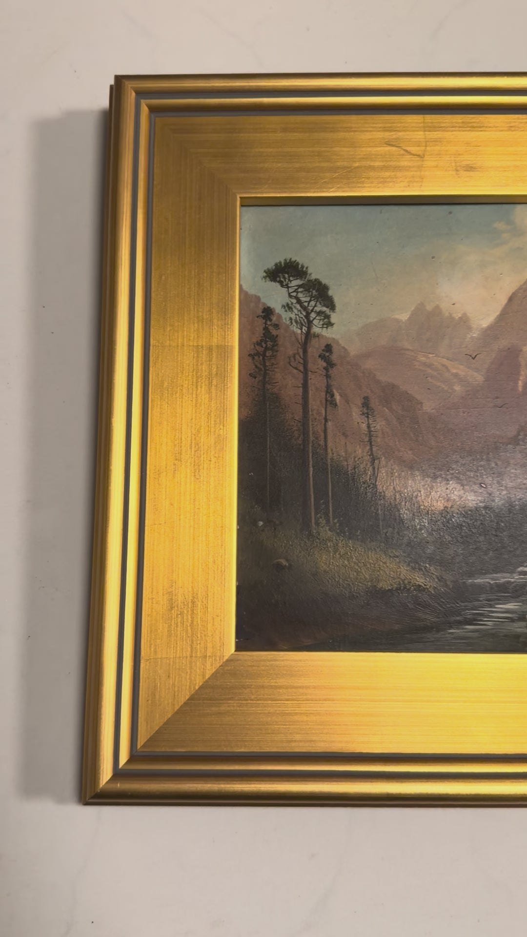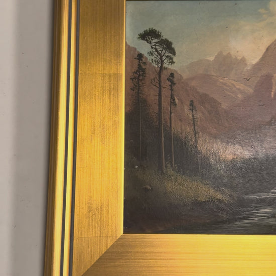 A beautiful antique oil on board painting, intricately detailed and signed Fisher. D.A. Fisher (1867-1940) was an American artist renowned for his landscapes, particularly in Portland, Maine, San Francisco, and Mount Shasta. This piece is oil on canvas laid down on board, monogrammed DAF, and framed in giltwood.