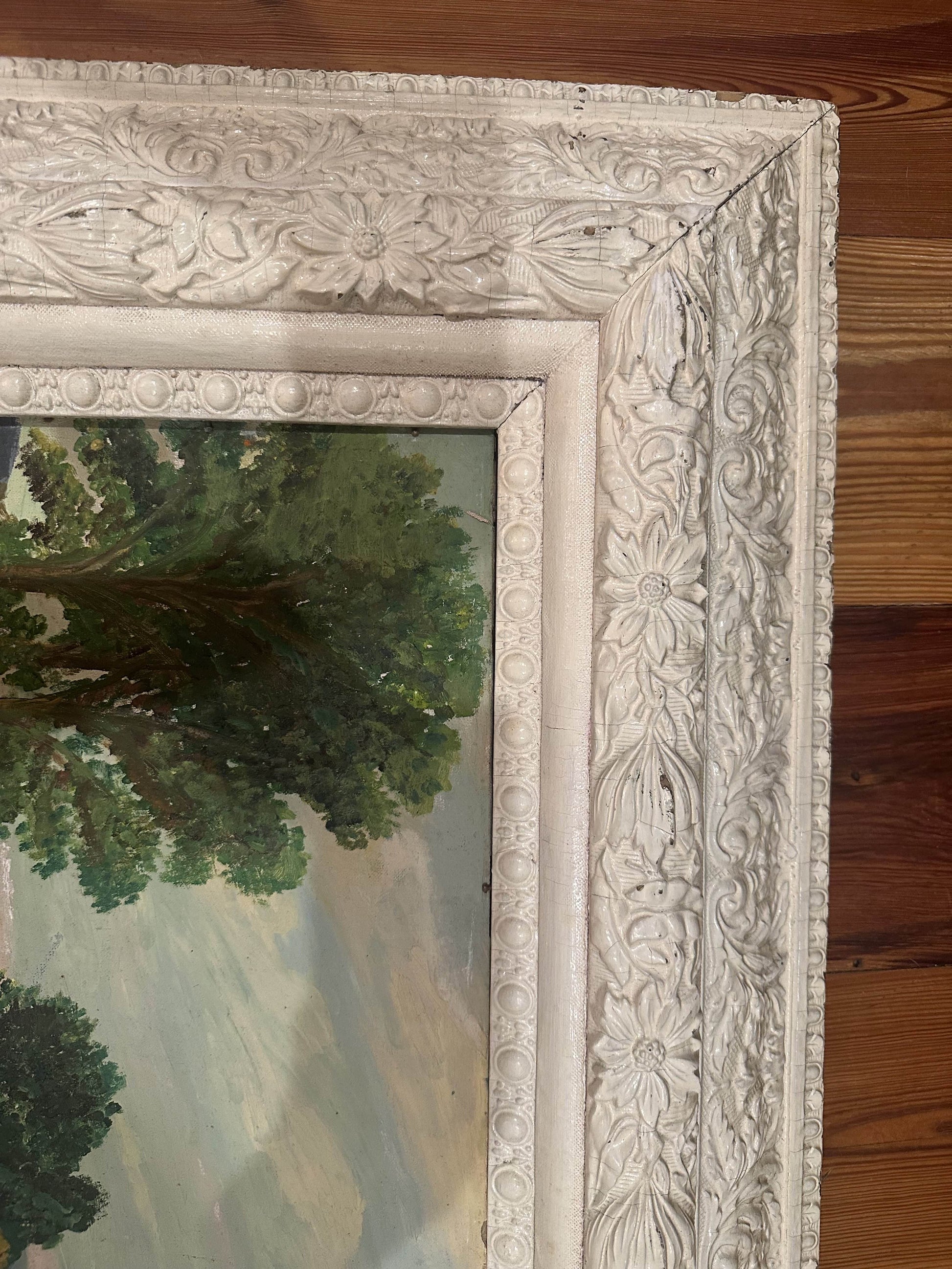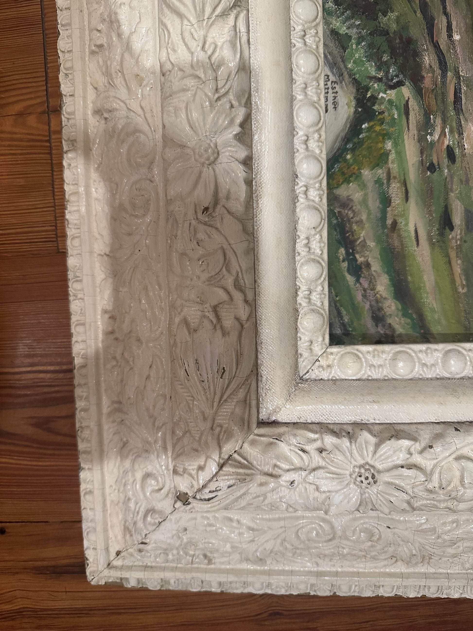 Esther Mittman's original oil painting on board showcases a serene landscape, beautifully presented in an exquisite ornate frame. Signed lower right. Minor wear due to aging.
