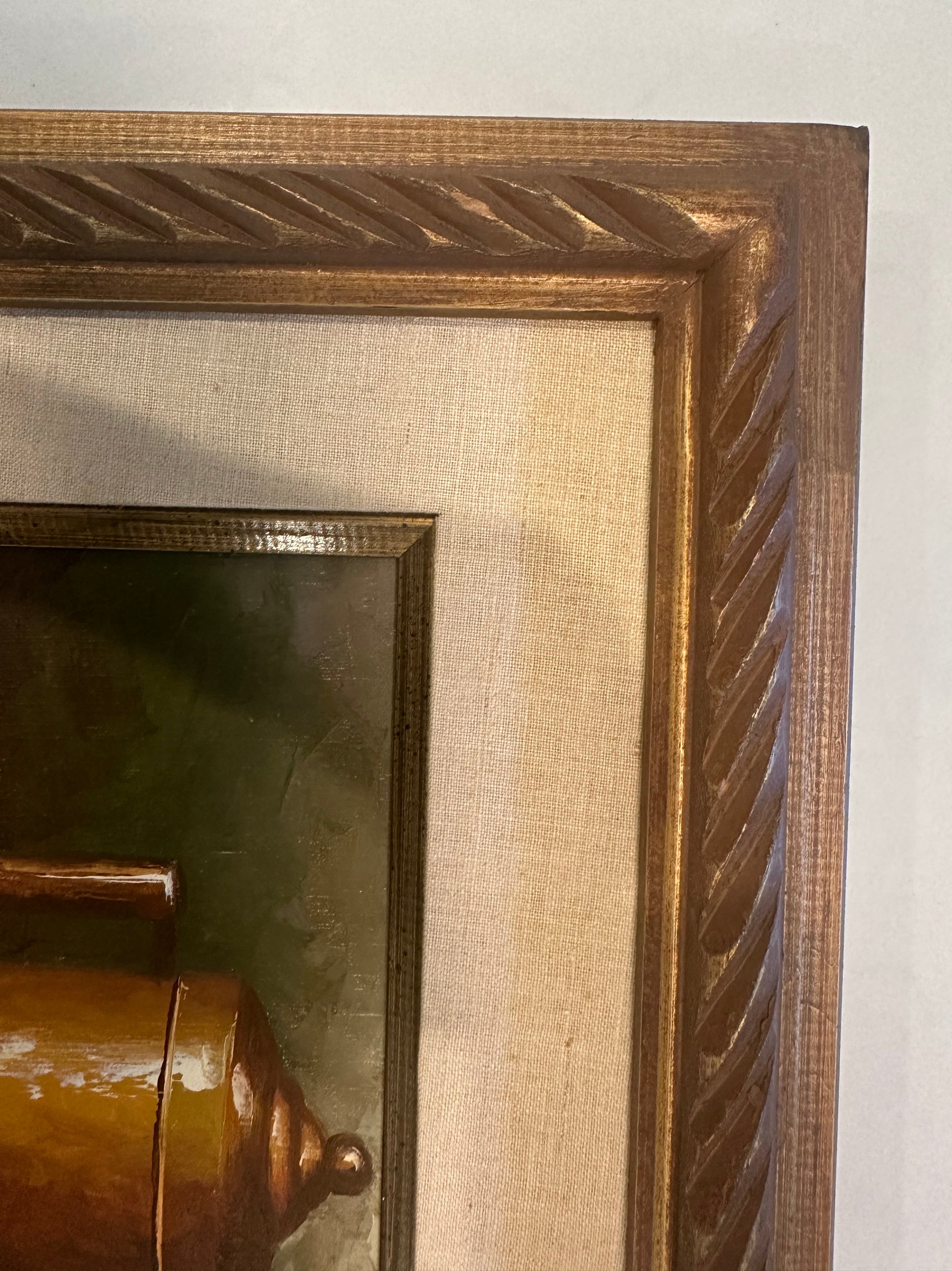 A Modernist oil painting on canvas depicting a still life with a copper tea pot and fruits. Signed by the artist, lower left. Framed. One of a kind artwork.