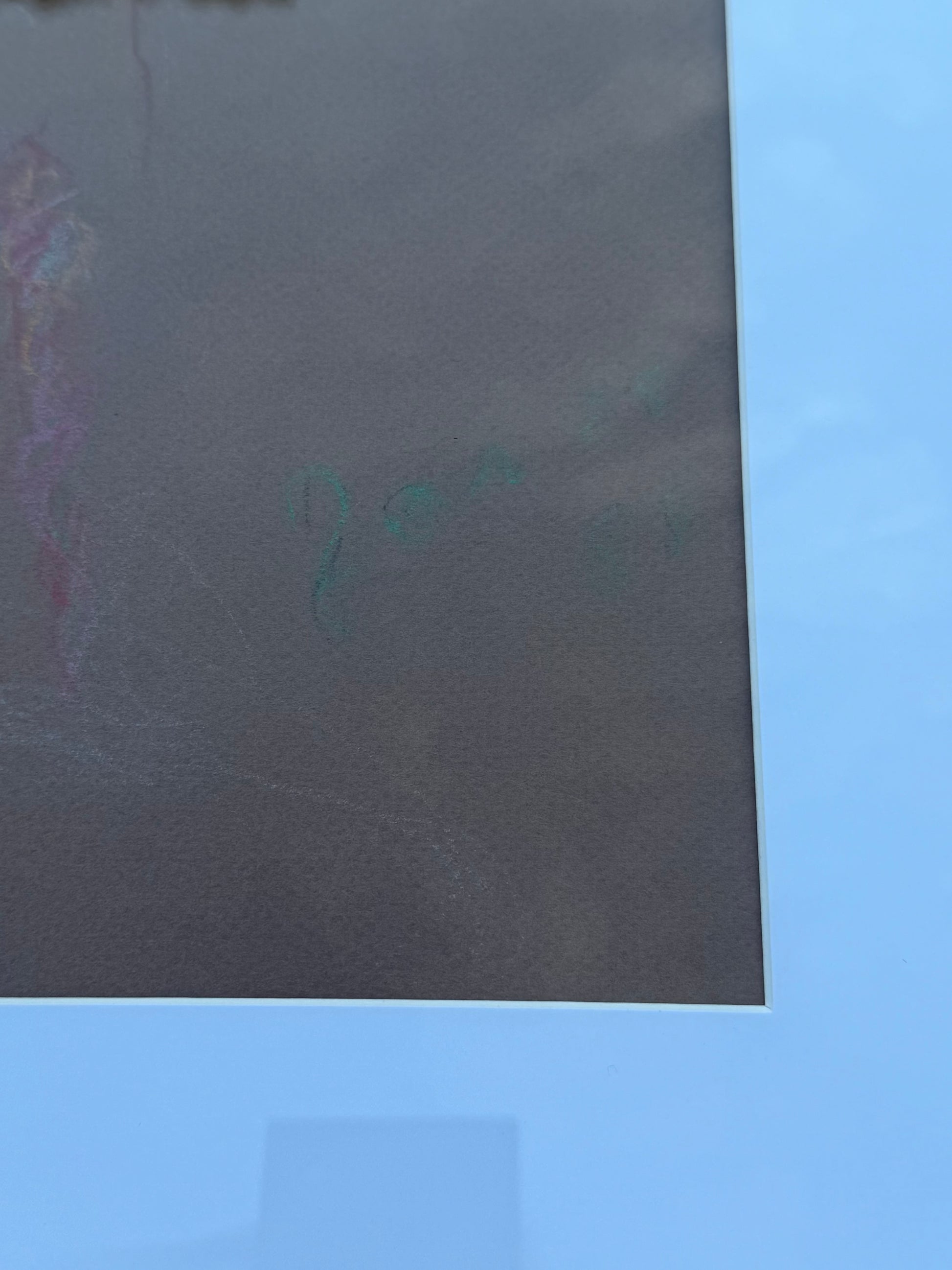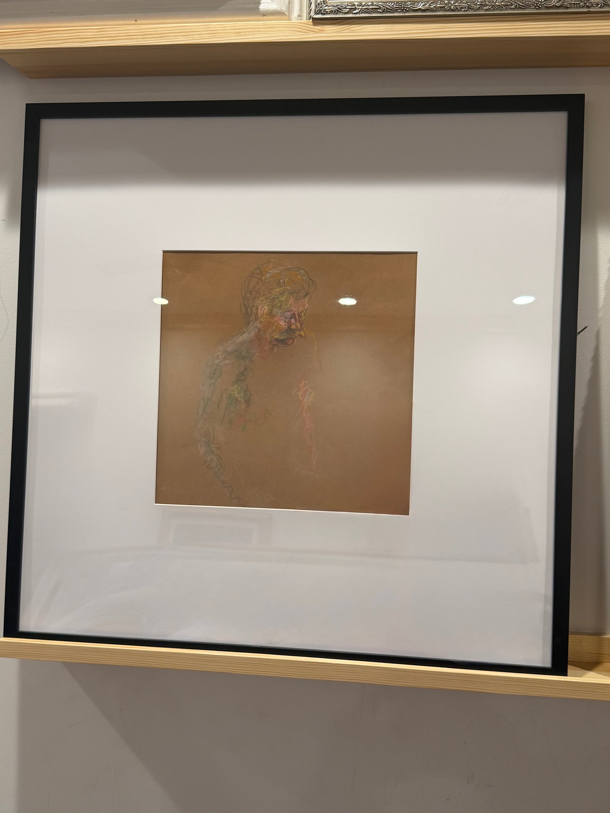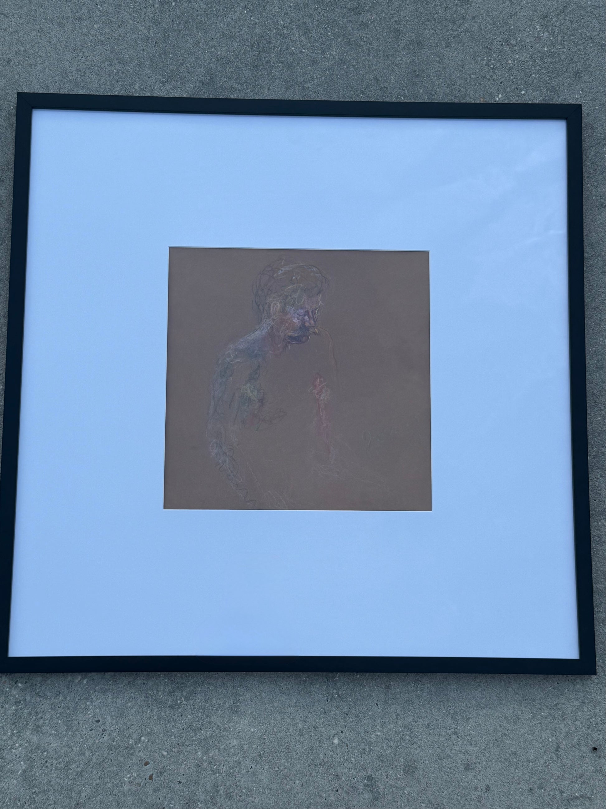 Charcoal drawing of a mustached man by a New Orleans artist in a cool black frame with oversized mat. Signed original.