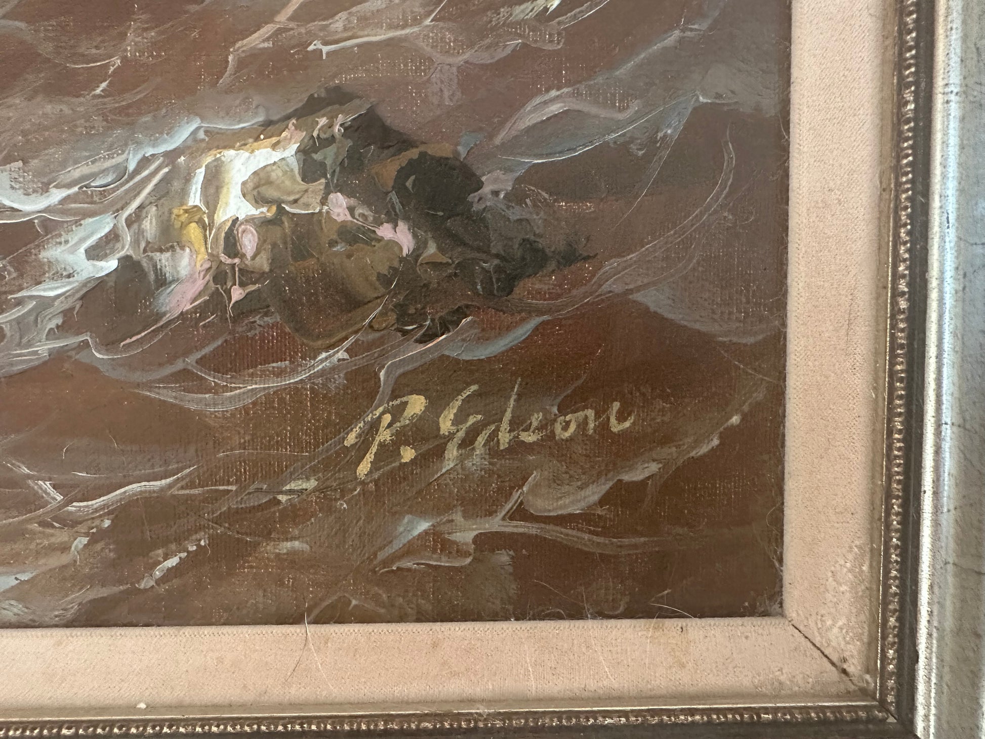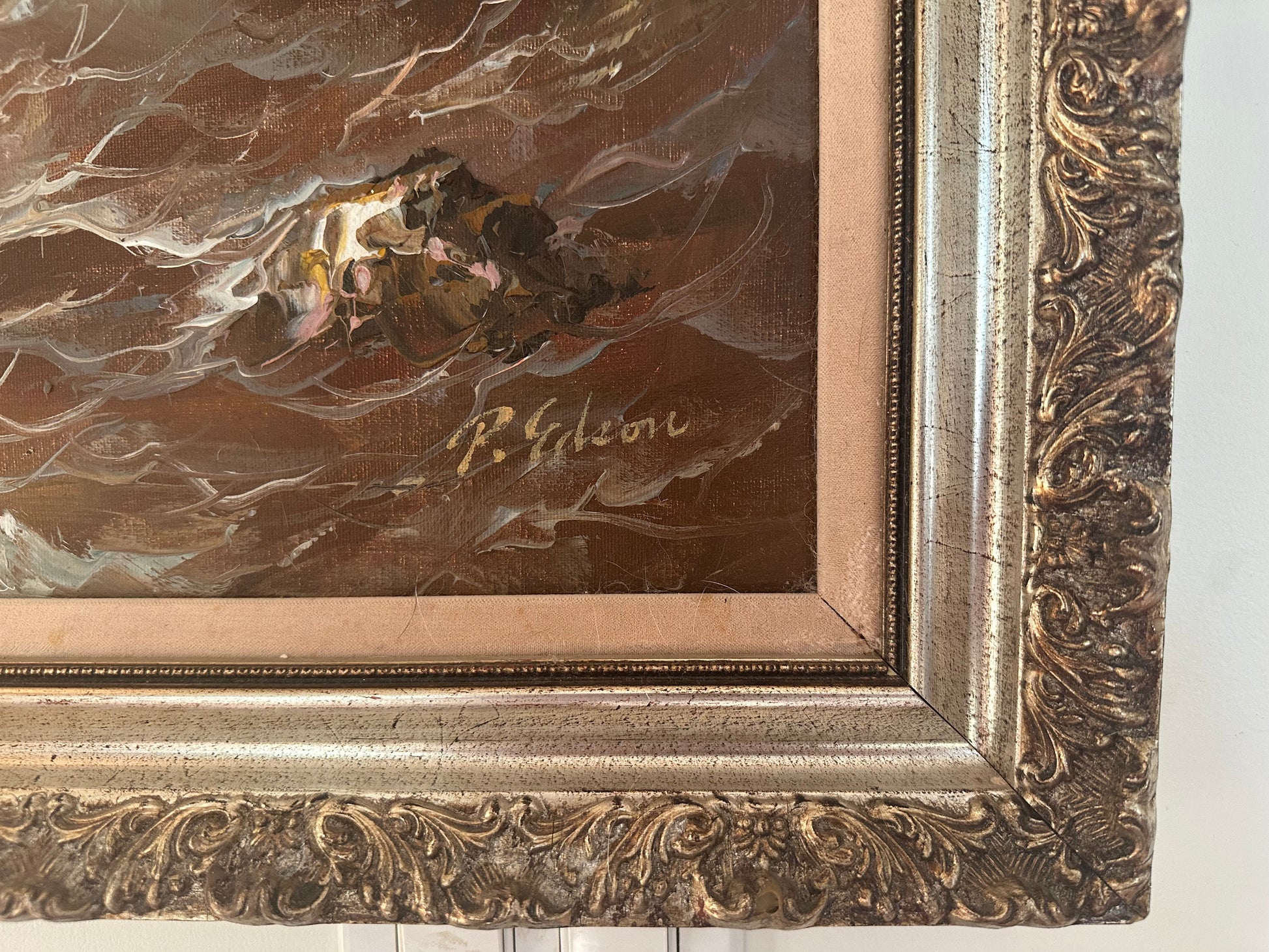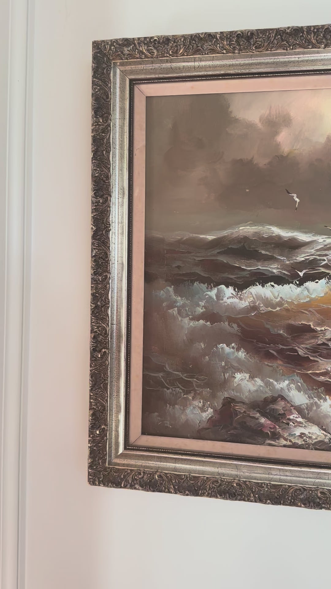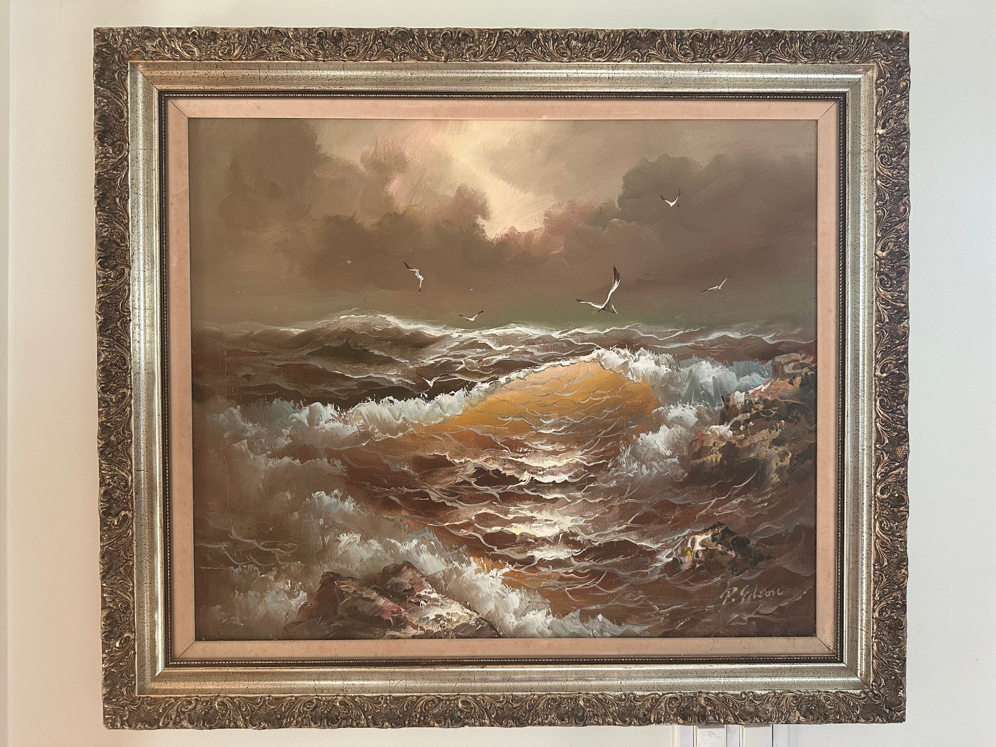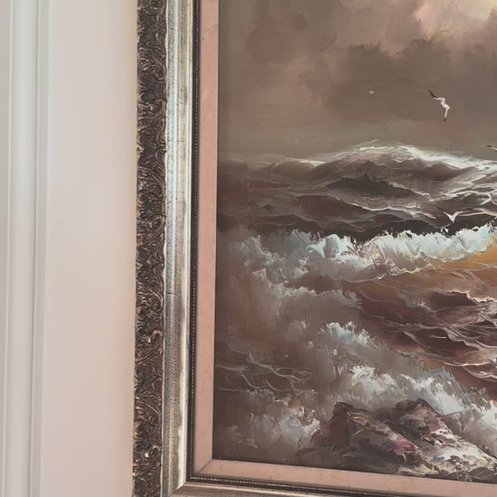 Gorgeous wild sea with seagulls in a storm, signed lower right. Ornate frame.