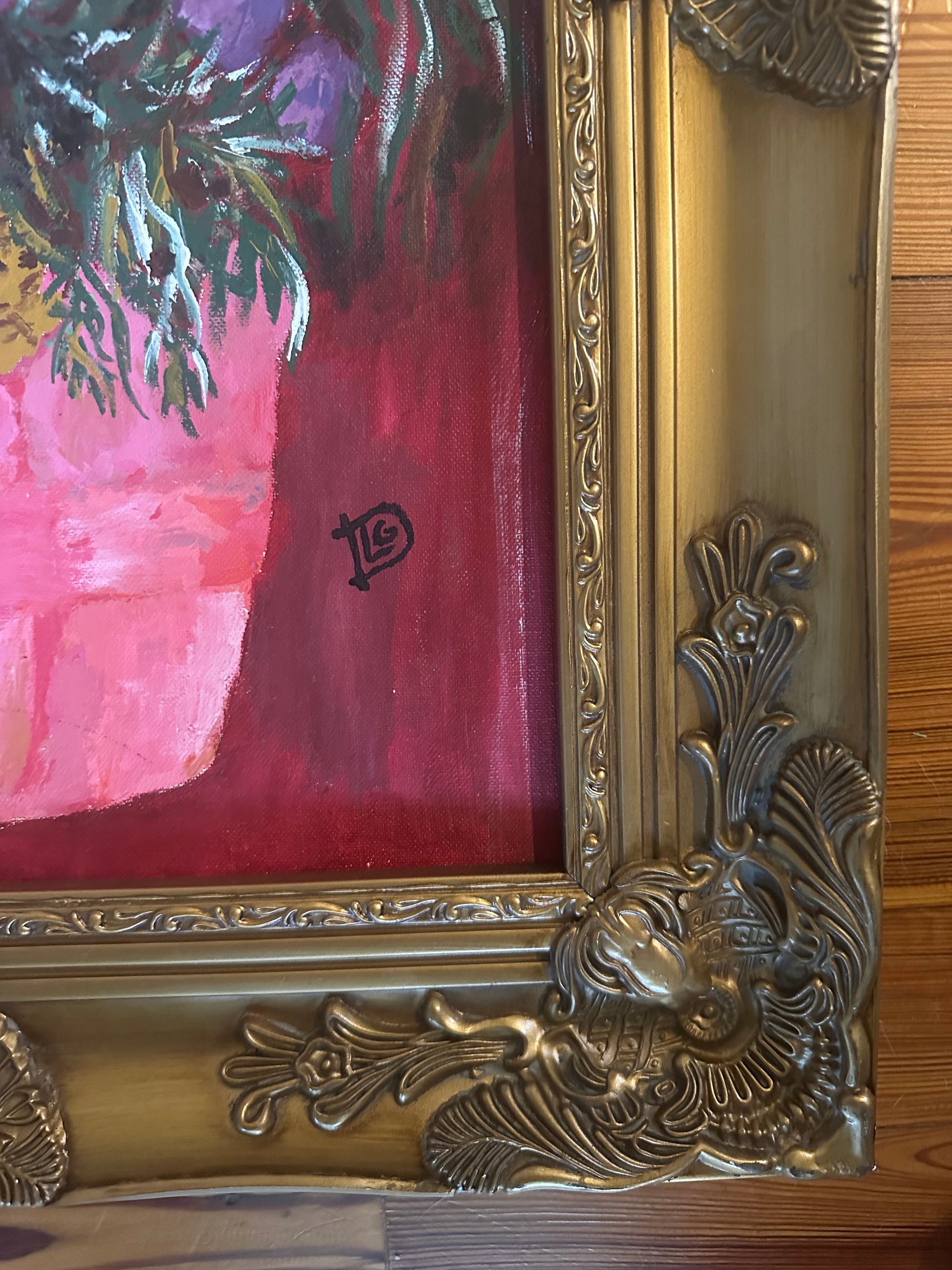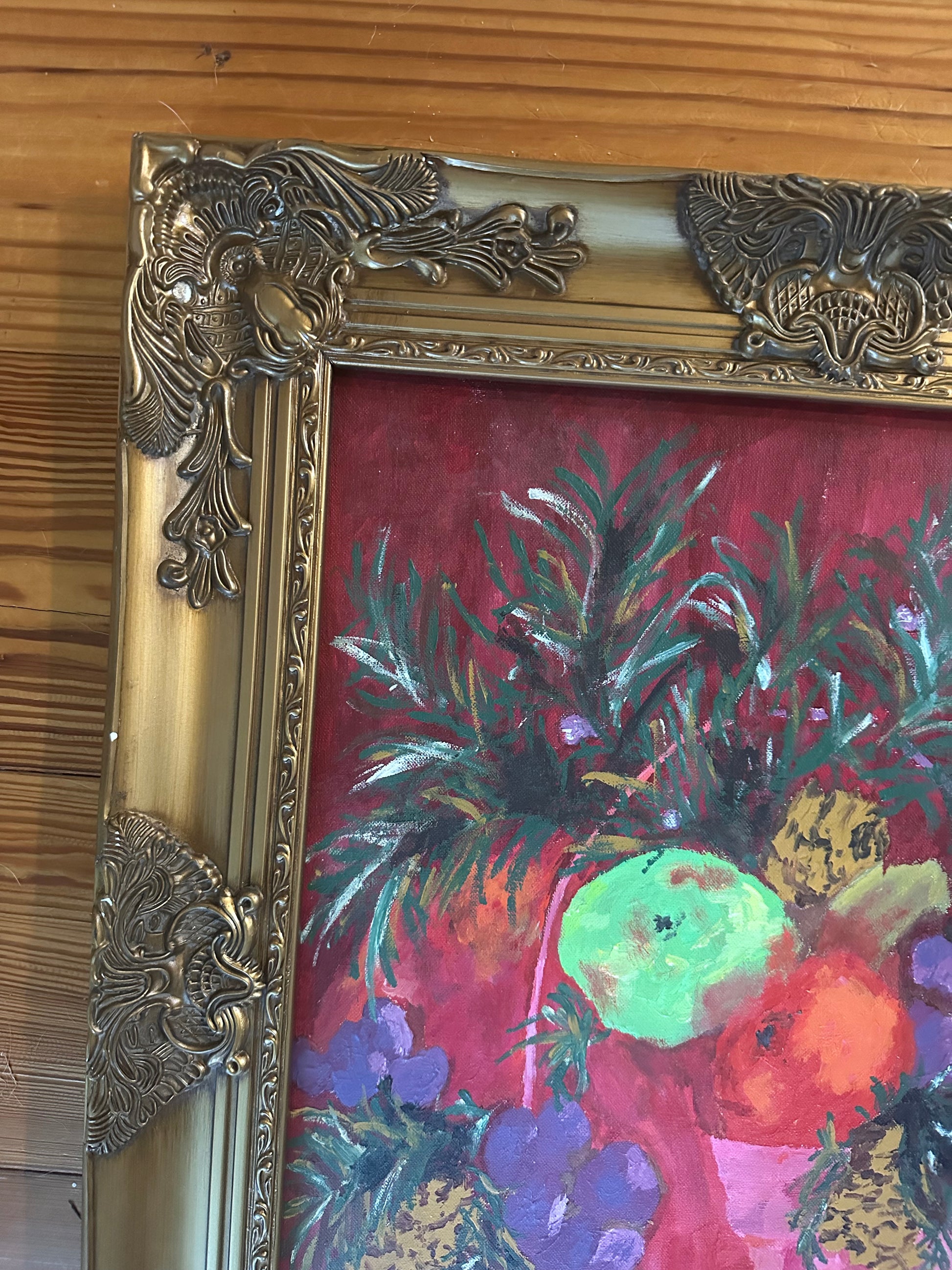 Abstract acrylic painting of fruit and foliage in a handsome gold frame by a New Orleans artist. The colors are so vibrant against the red background.