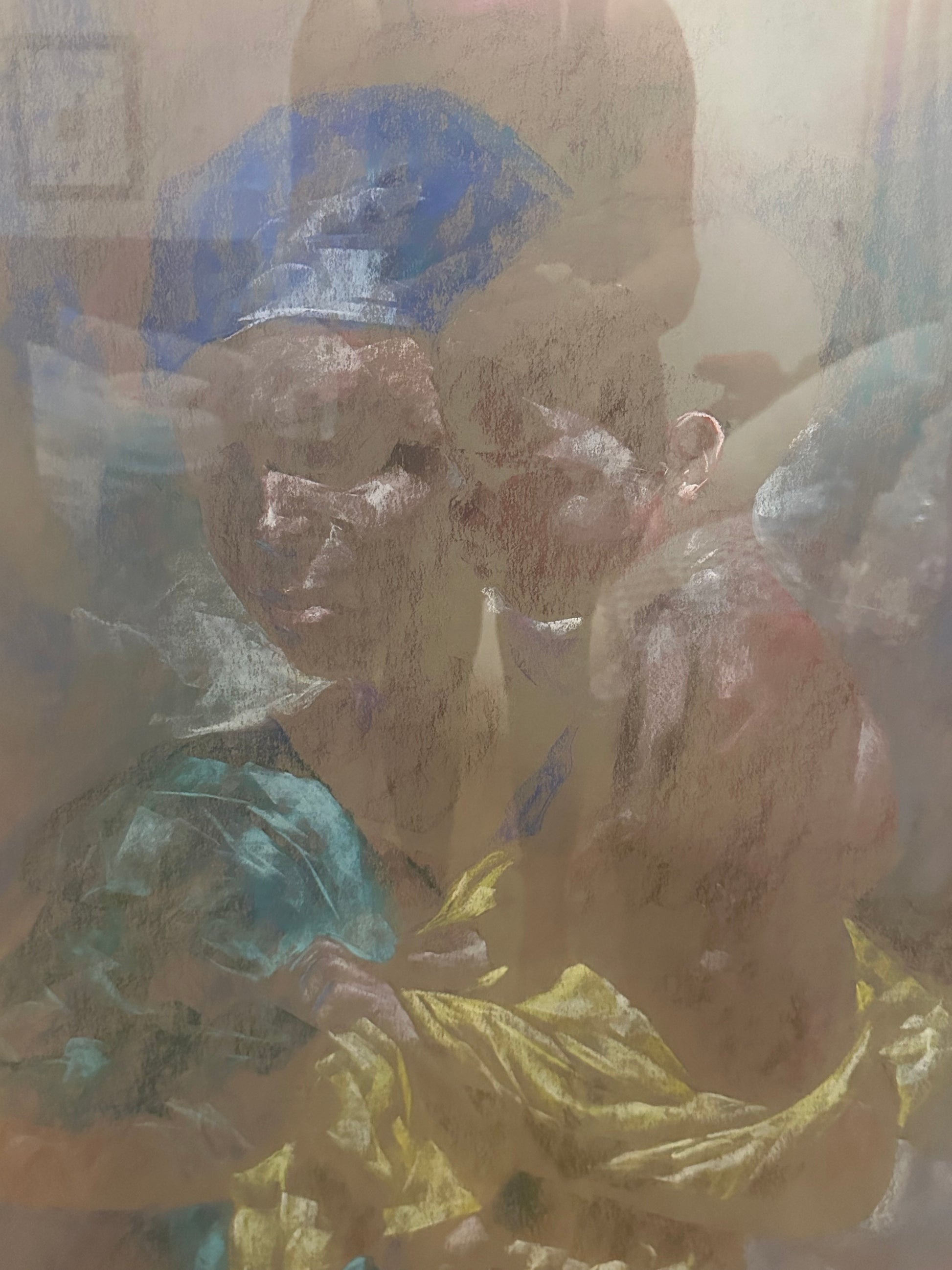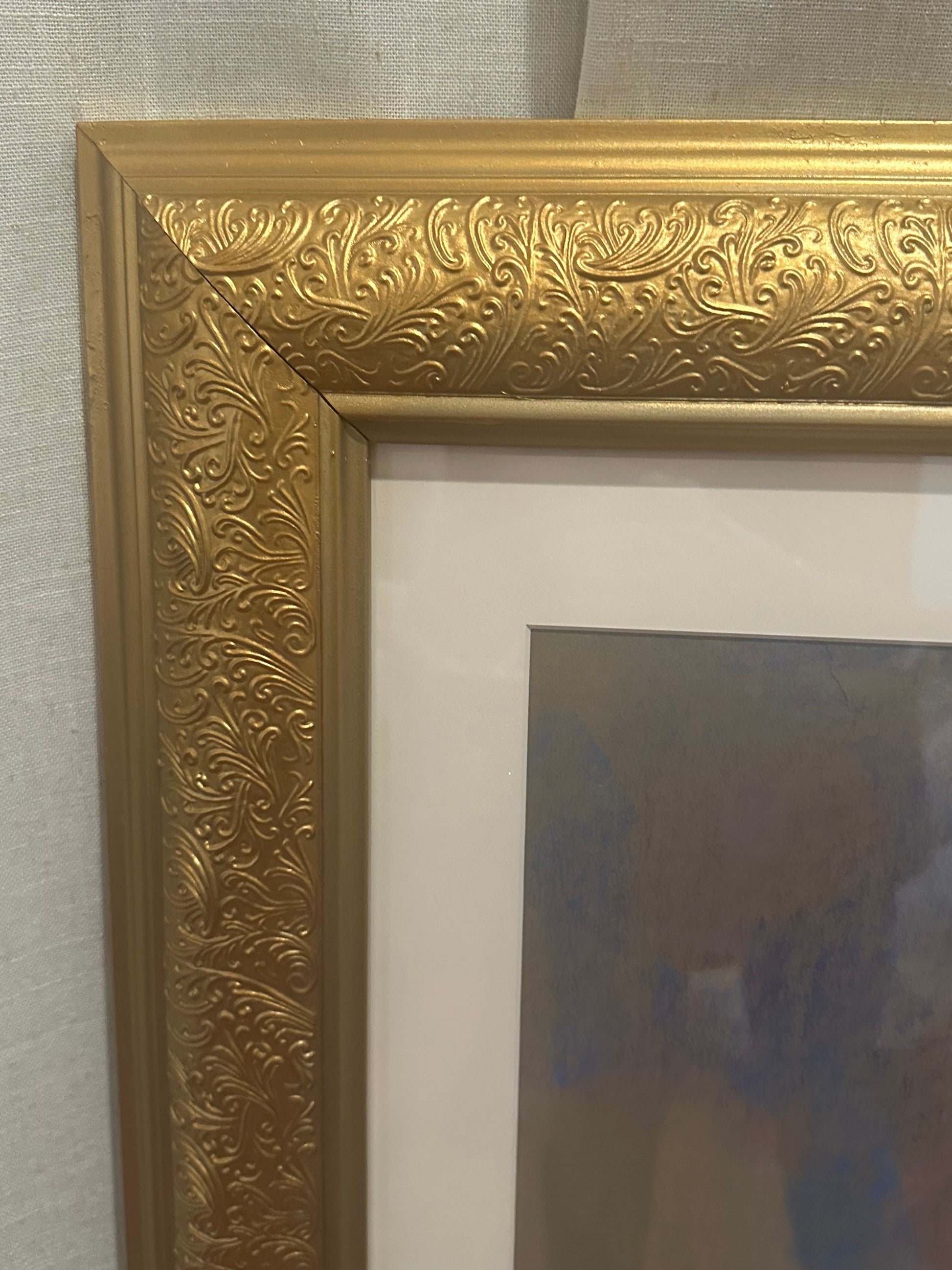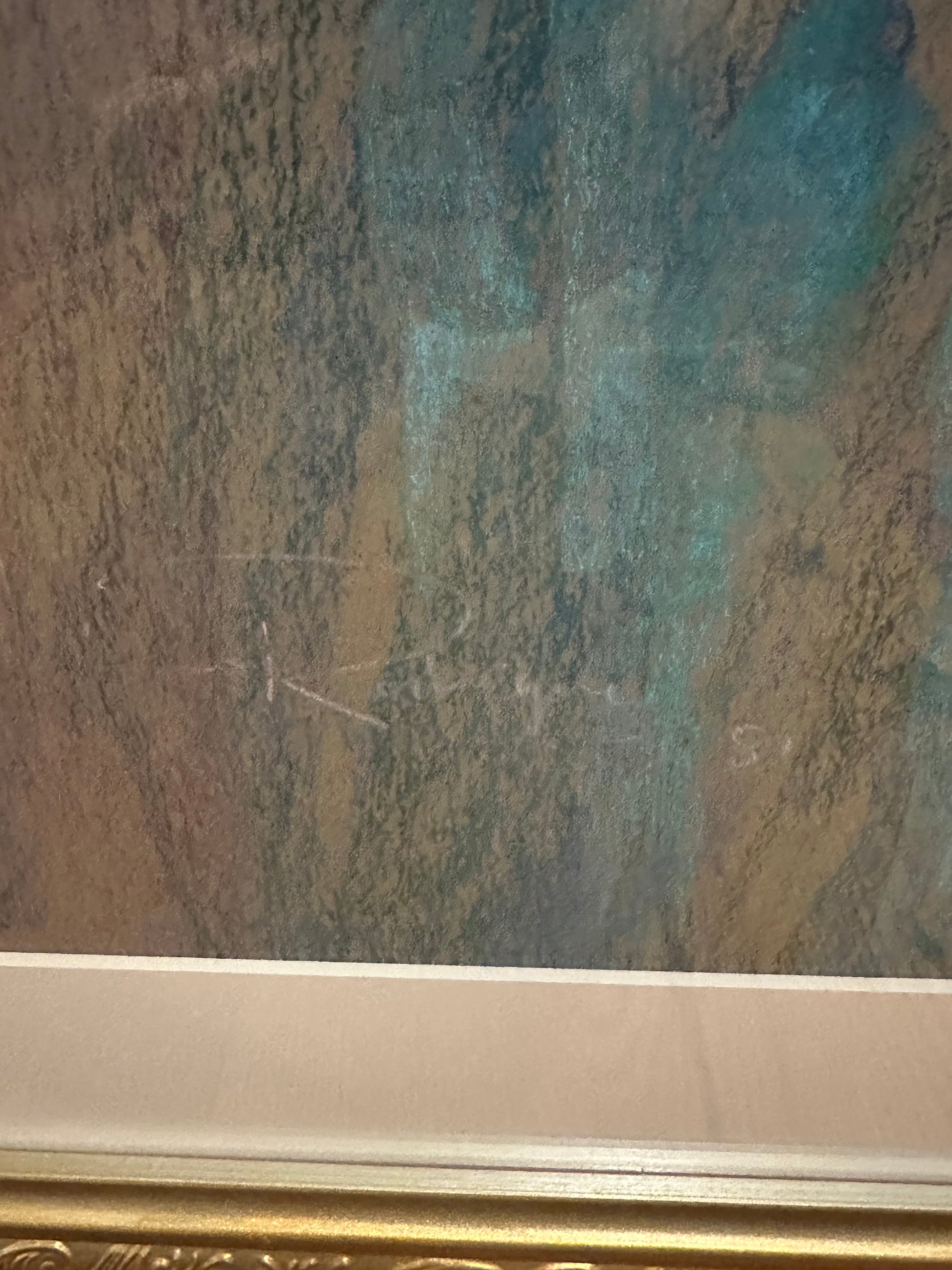 Gorgeous blue-hued pastel drawing. American School 1981, custom framed in gorgeous gold. Signed at lower left but illegible. A big piece for a big impact!