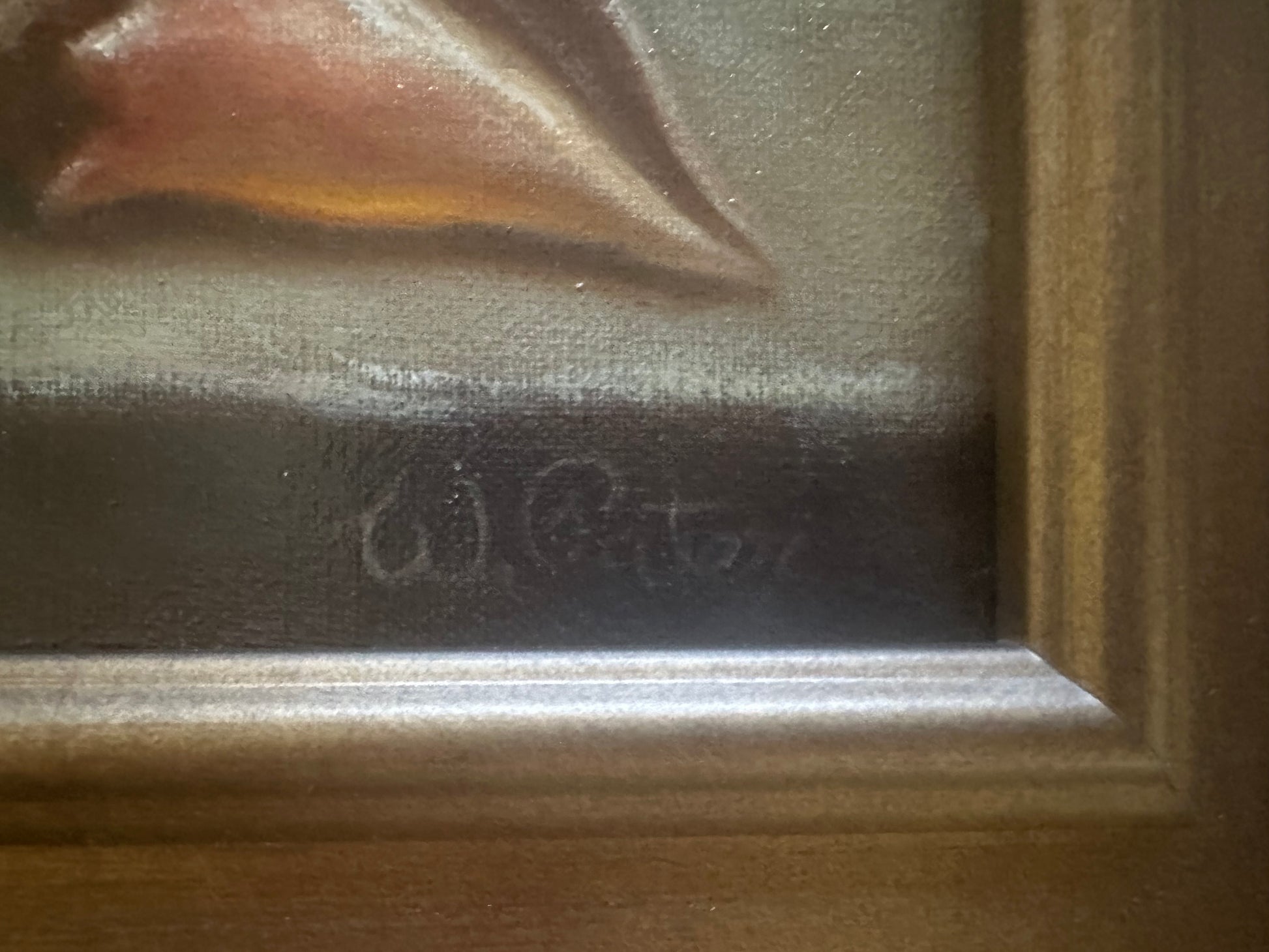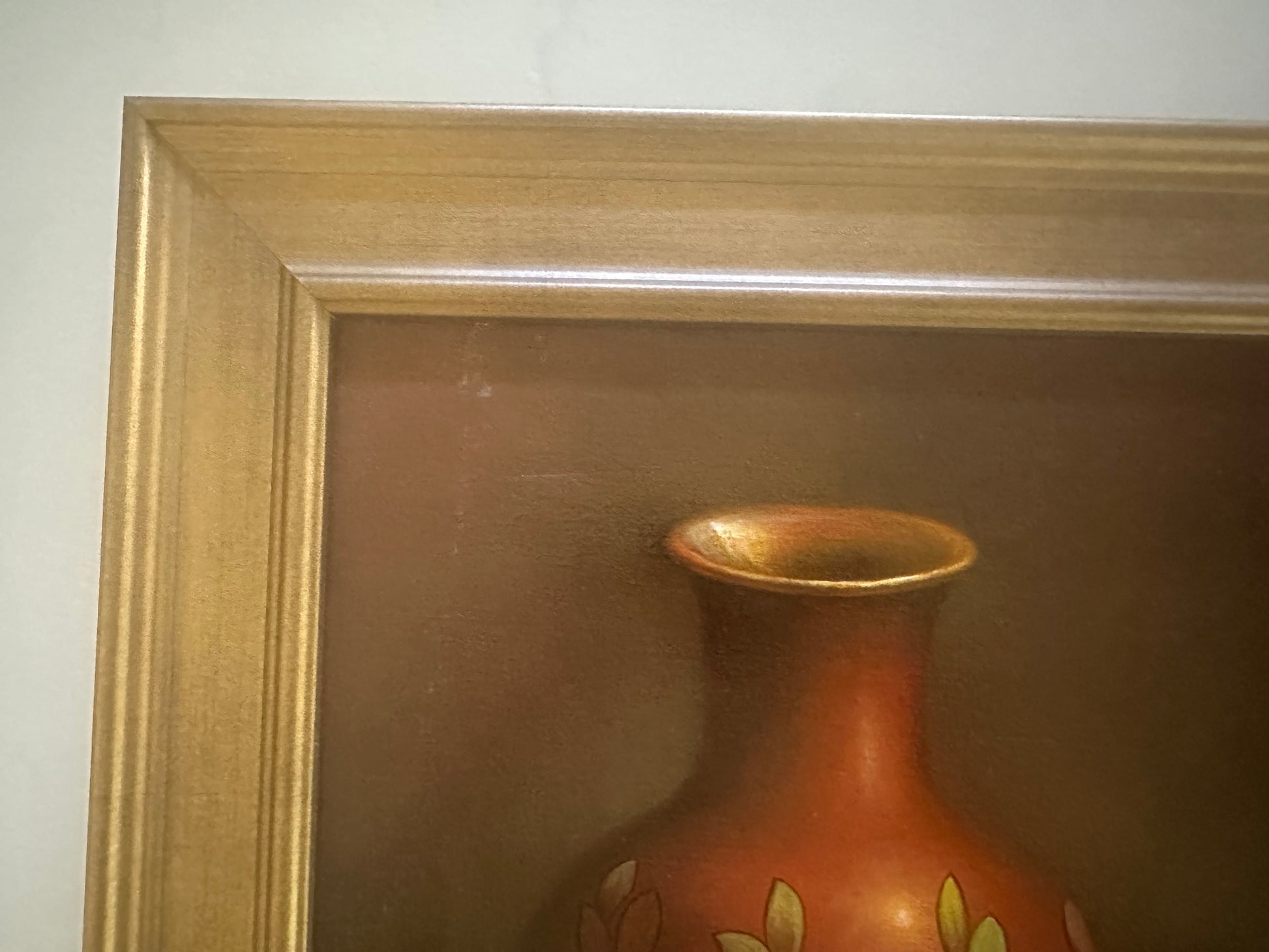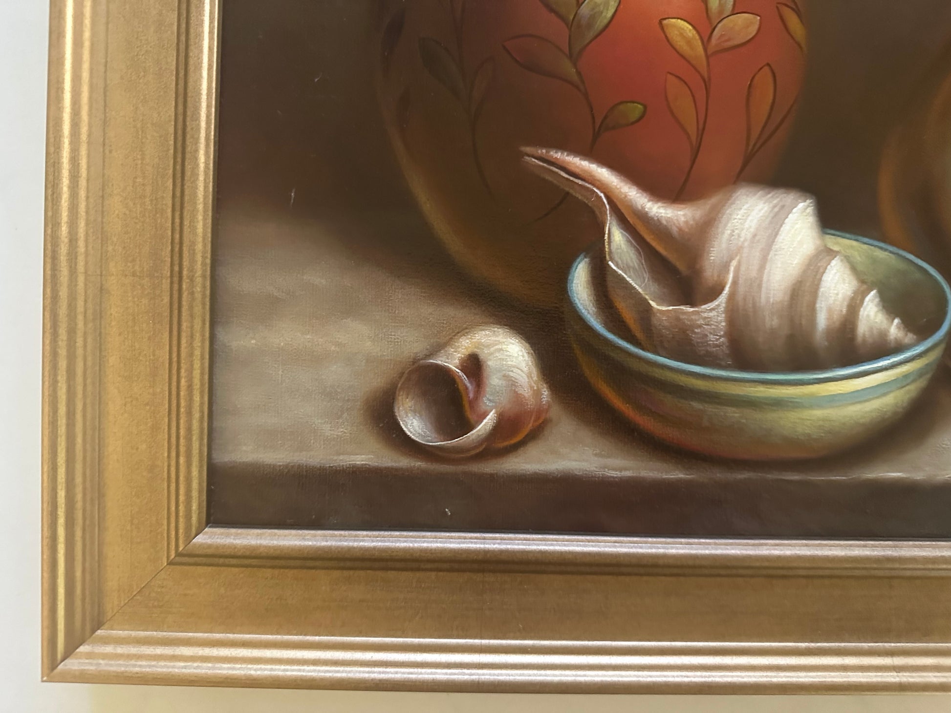 Fabulous, very realistic oil painting on canvas of a jug, vase and shell, signed lower right W. Pater. Some scratches/paint losses due to age (see photos). Framed in a gorgeous wide gold frame.
