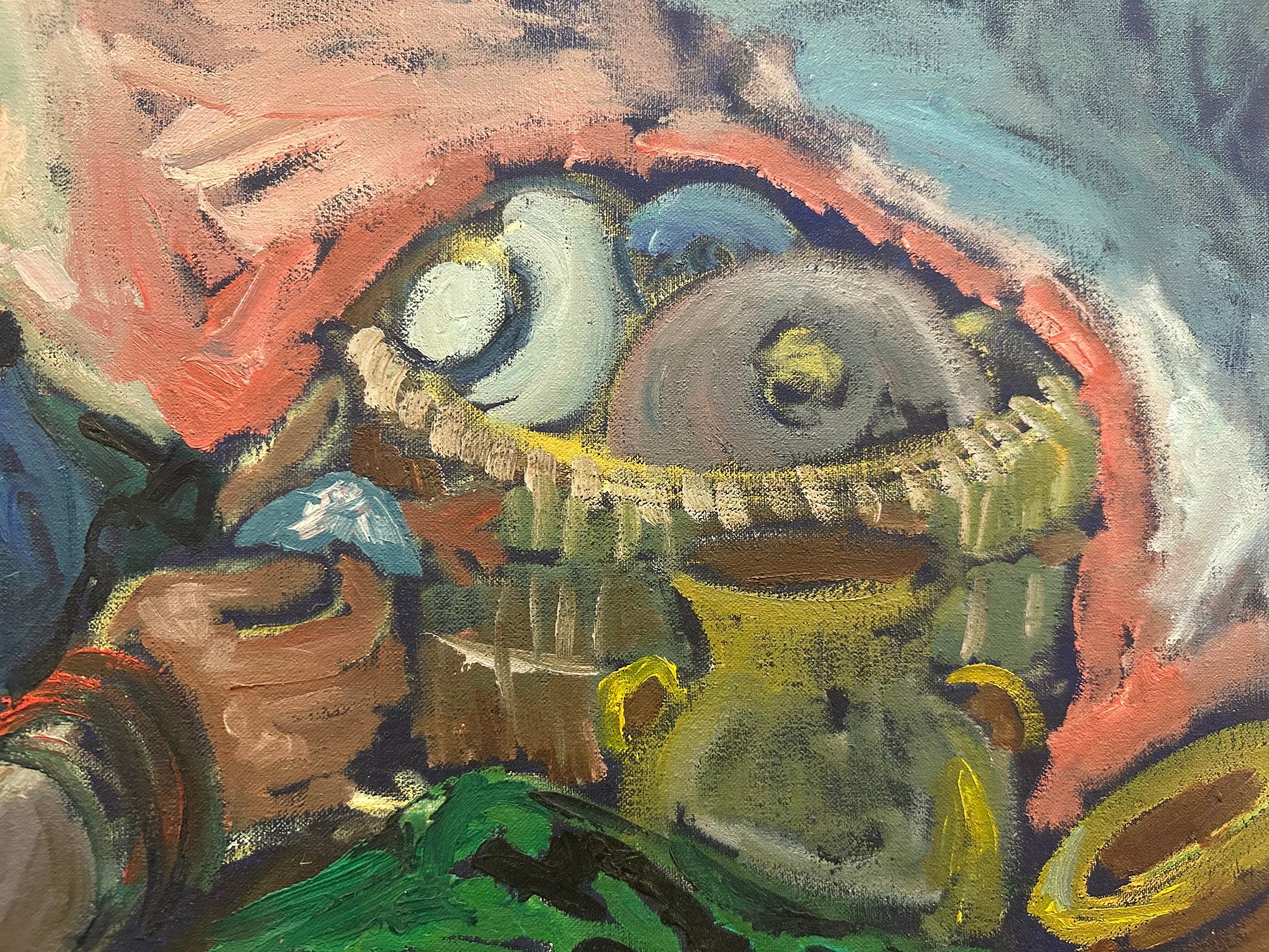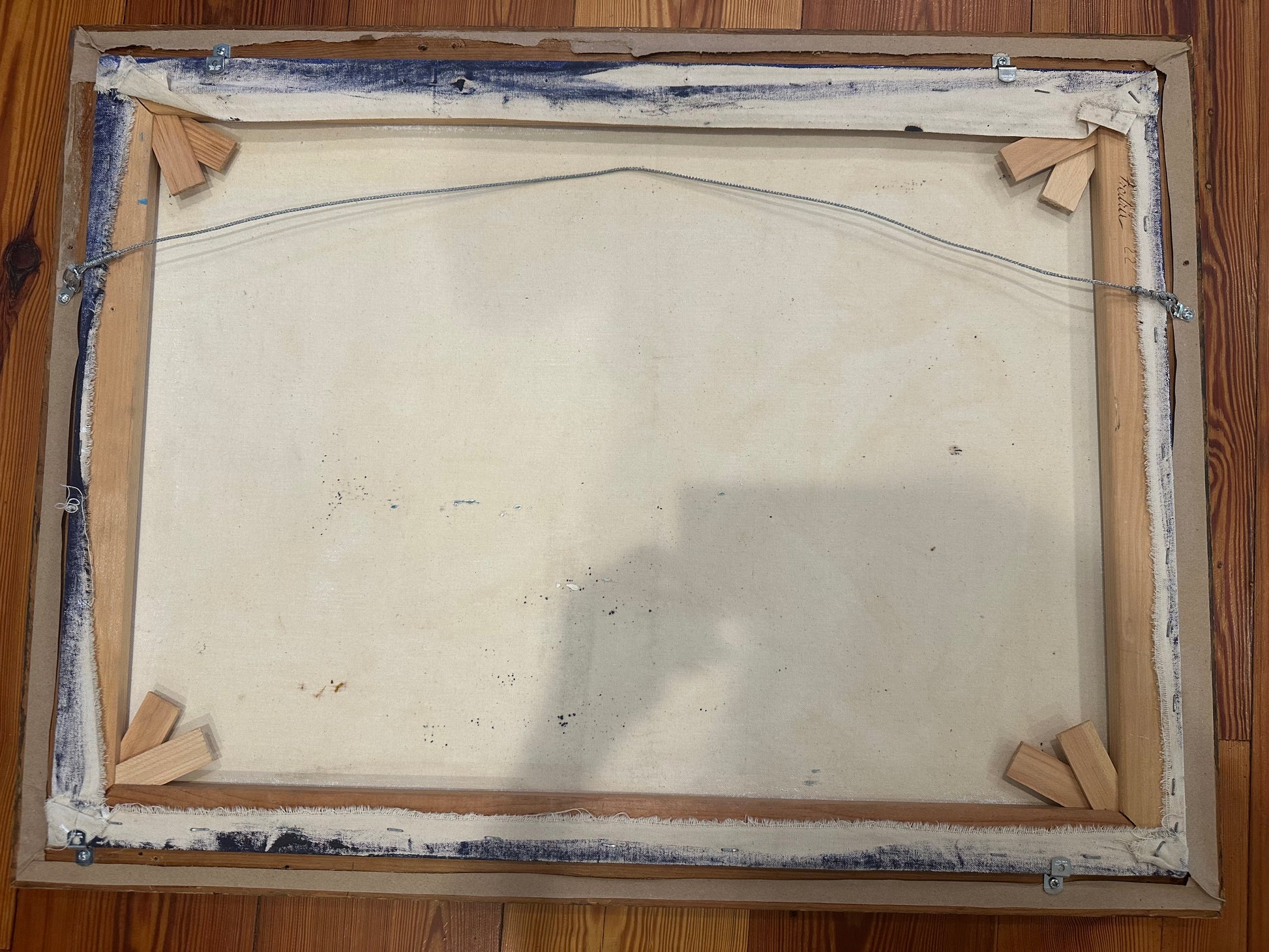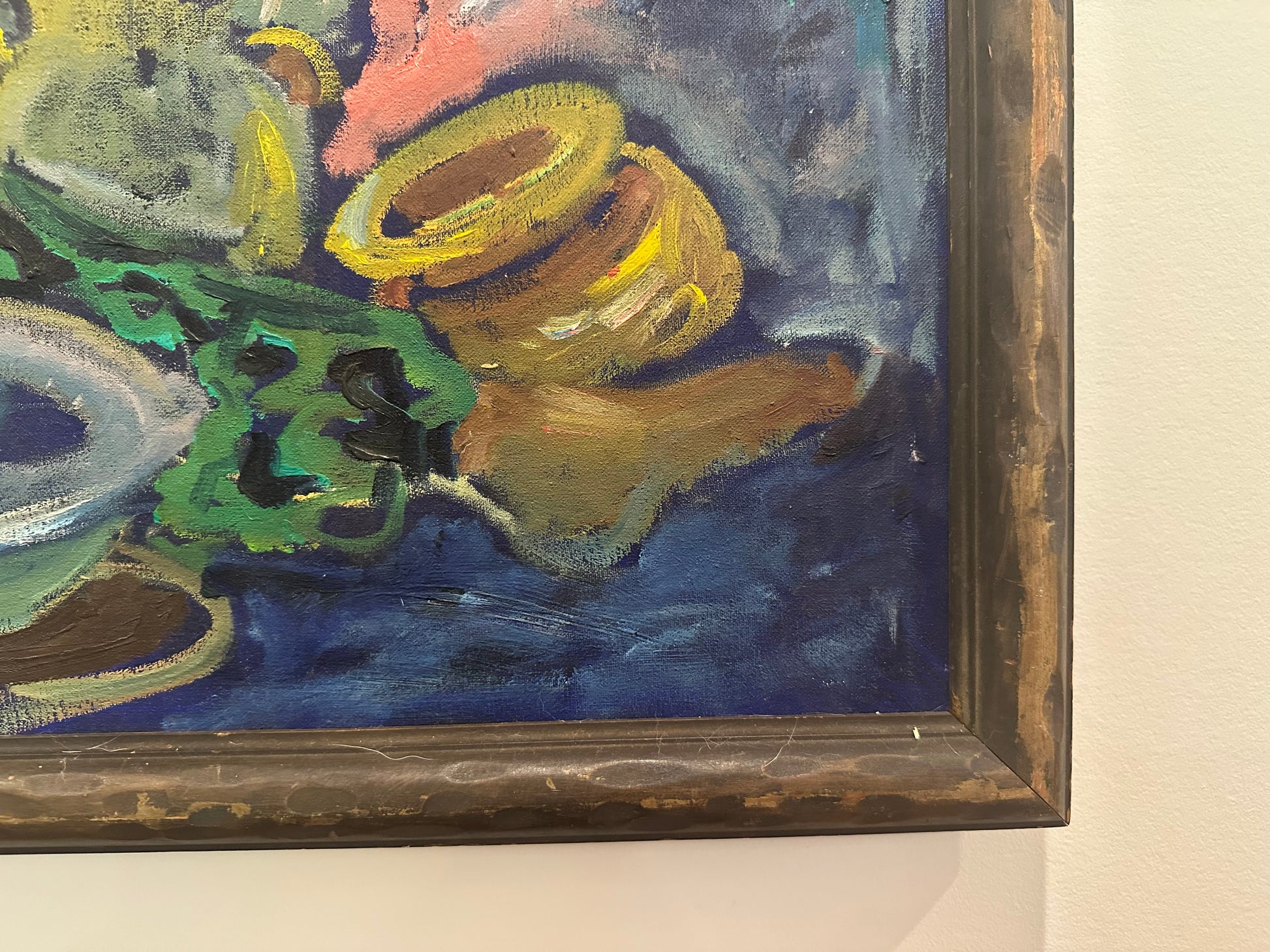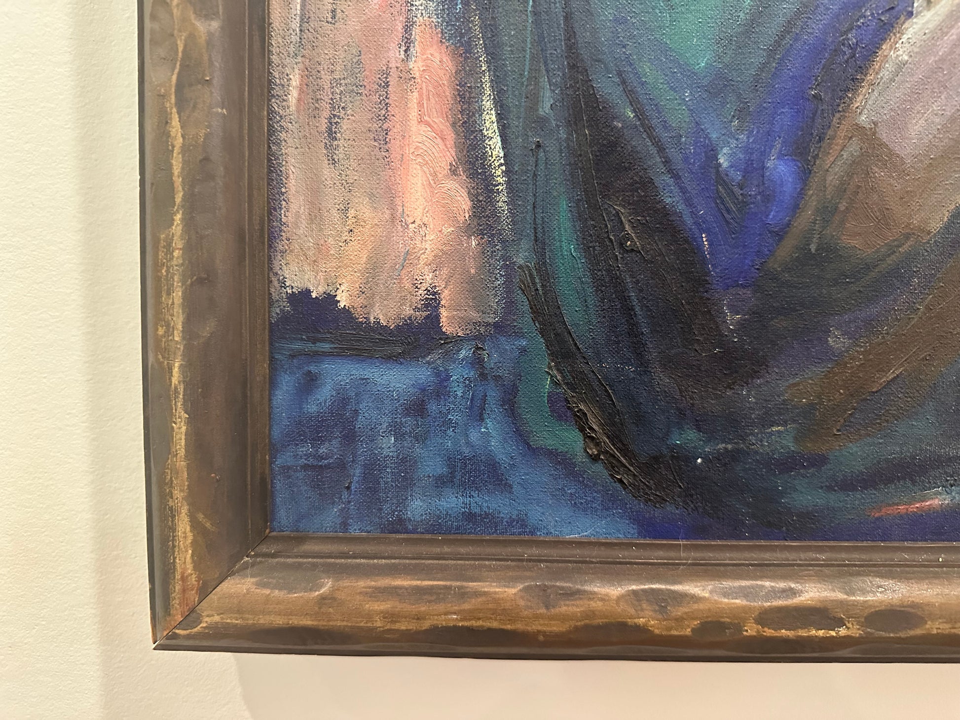 Vibrant, unique original oil on canvas of a ceramicist. American School 20th c. Unsigned in original wood frame.