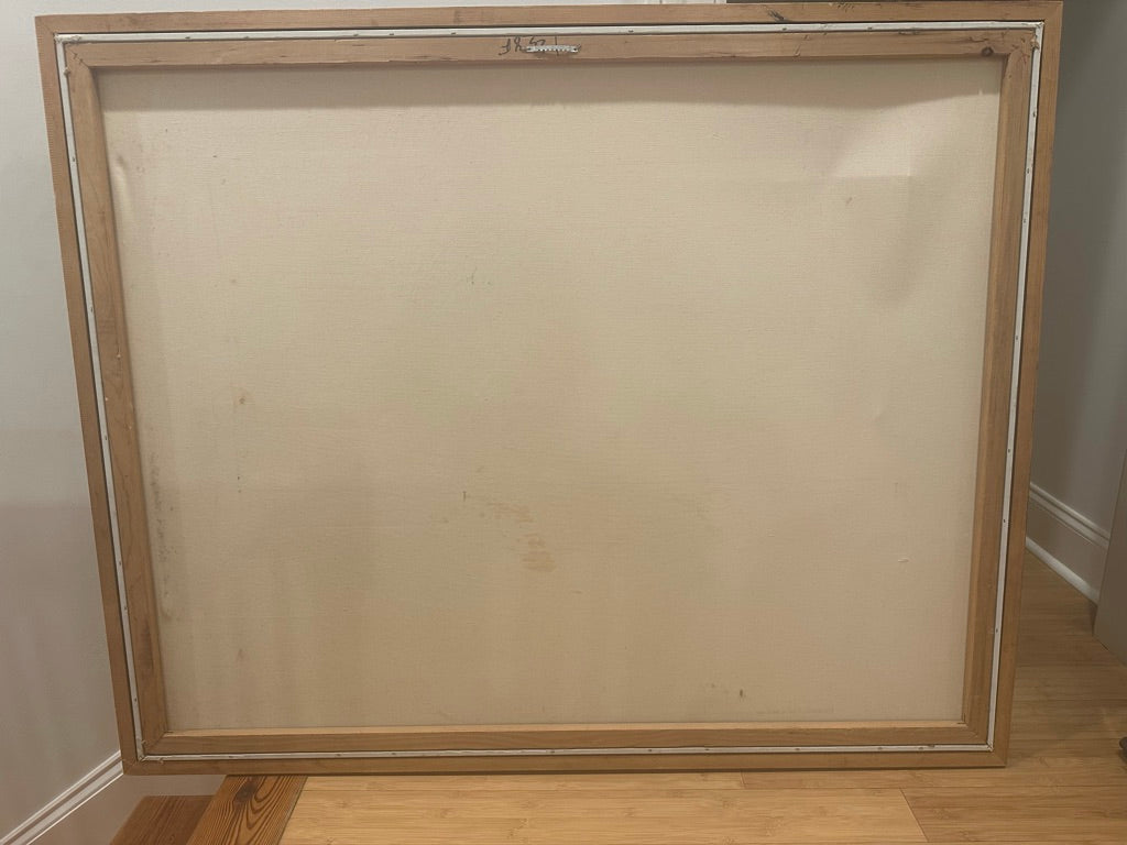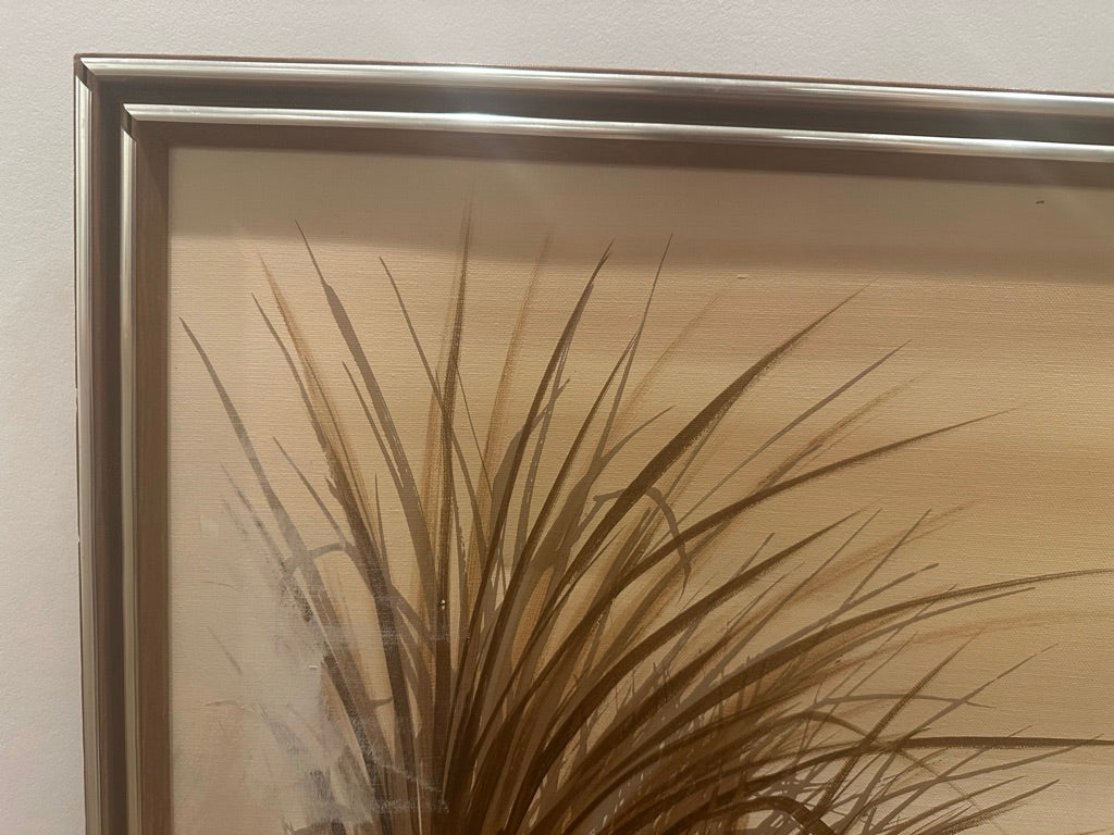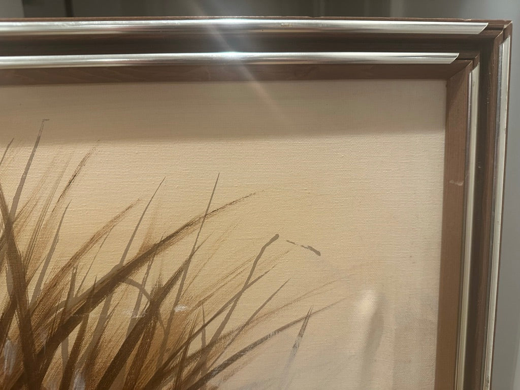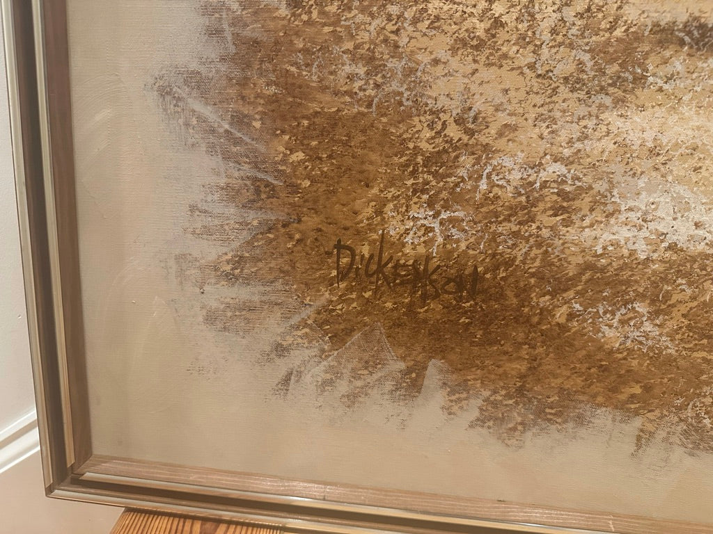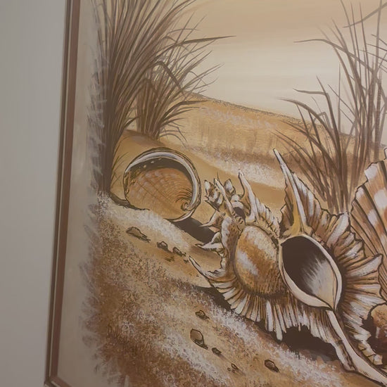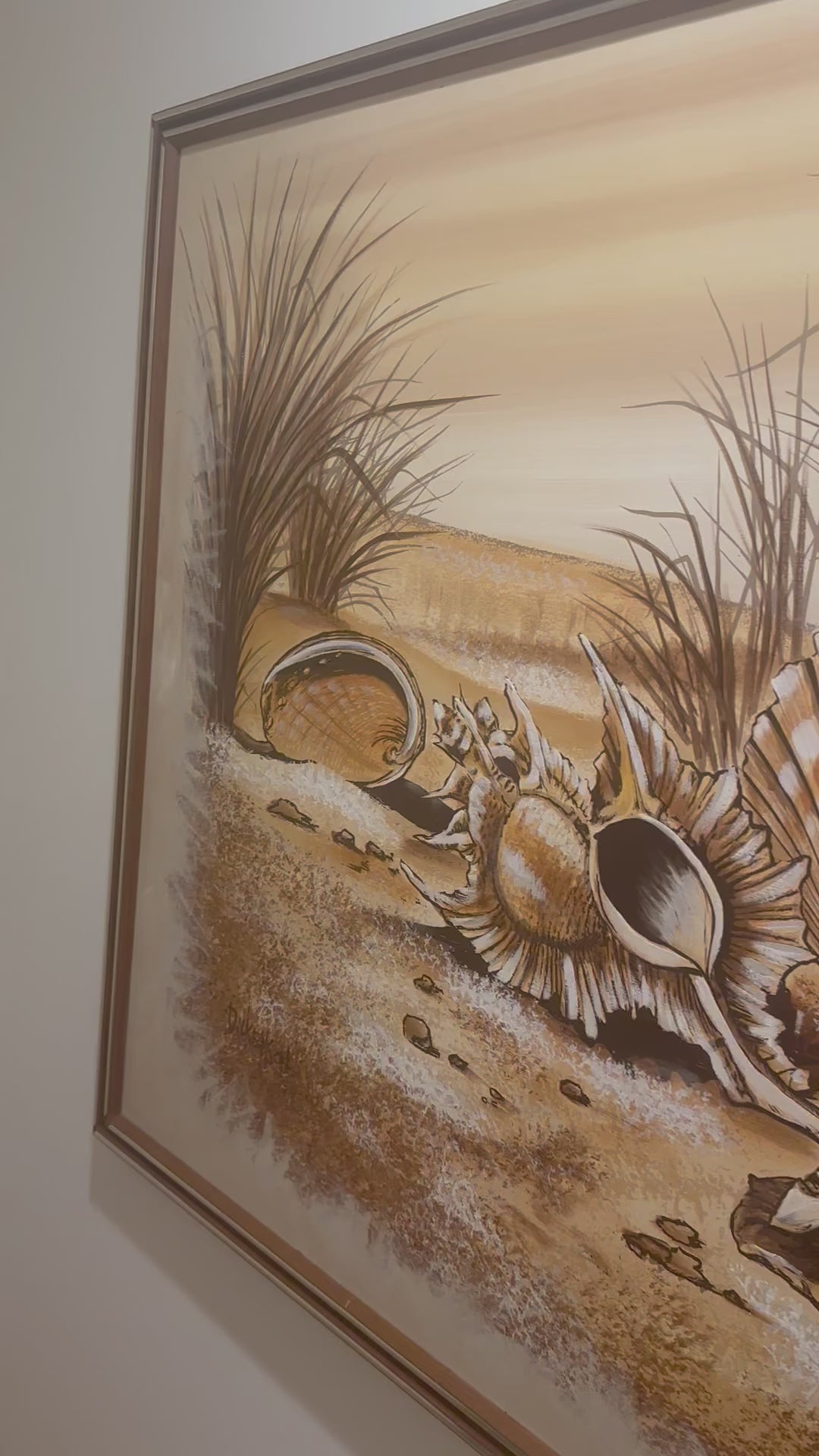 Splendid mid-century oil painting featuring large seashells, signed Dickenson. This oversized vintage piece showcases neutral-toned seashells on a serene beach scene, beautifully framed in original wood and signed by the artist. Perfect for a coastal retreat.