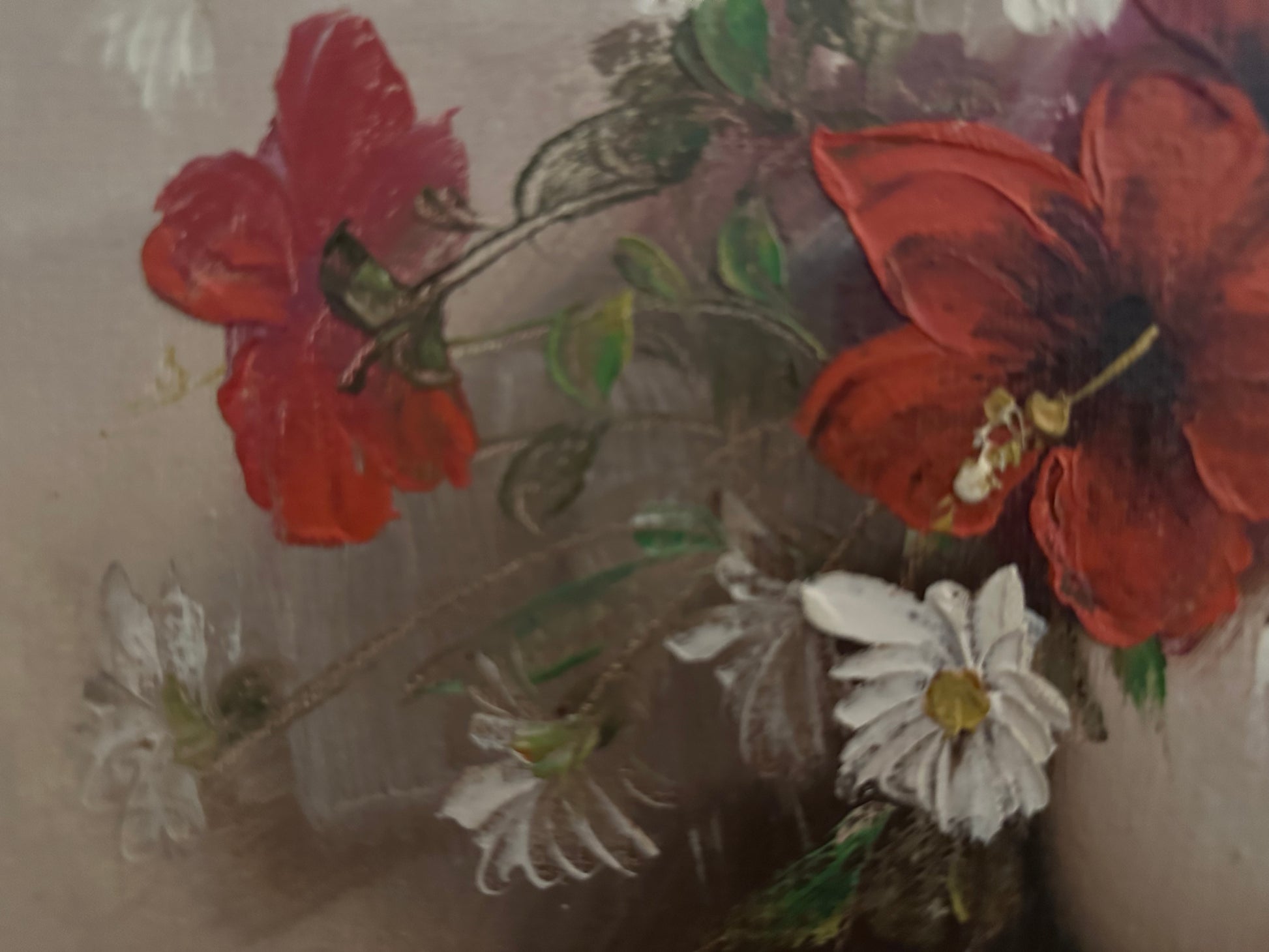 Signed oil on canvas featuring vibrant red hibiscus and white daisies. Dated 1978. Ferber is a decorative artist known for beautiful floral still-life paintings.