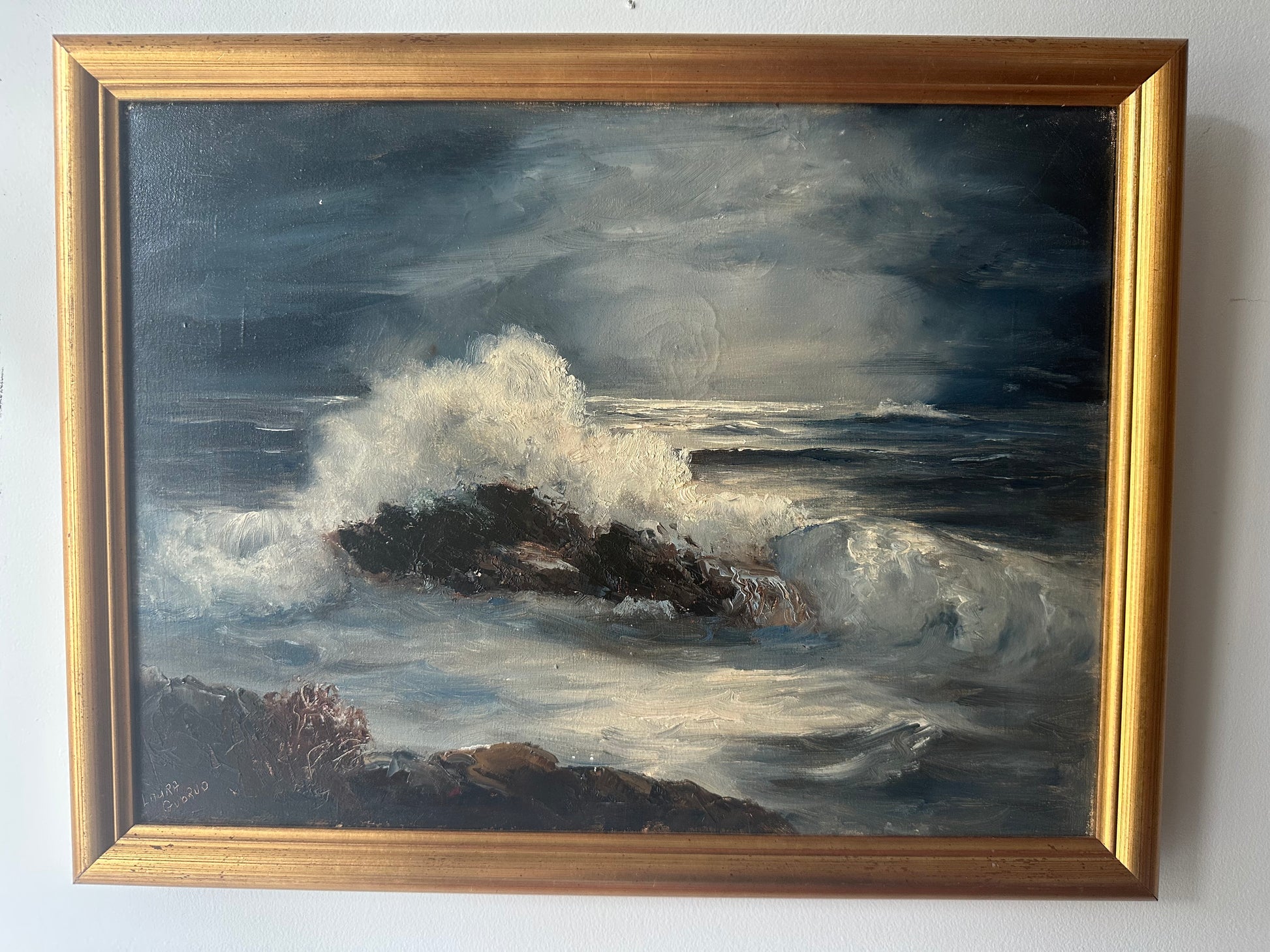 Stunning vintage seascape of waves crashing by Laura Gabriel. Signed on front and verso and dated June 1966. Beautiful oil on canvas with a gorgeous gold frame.